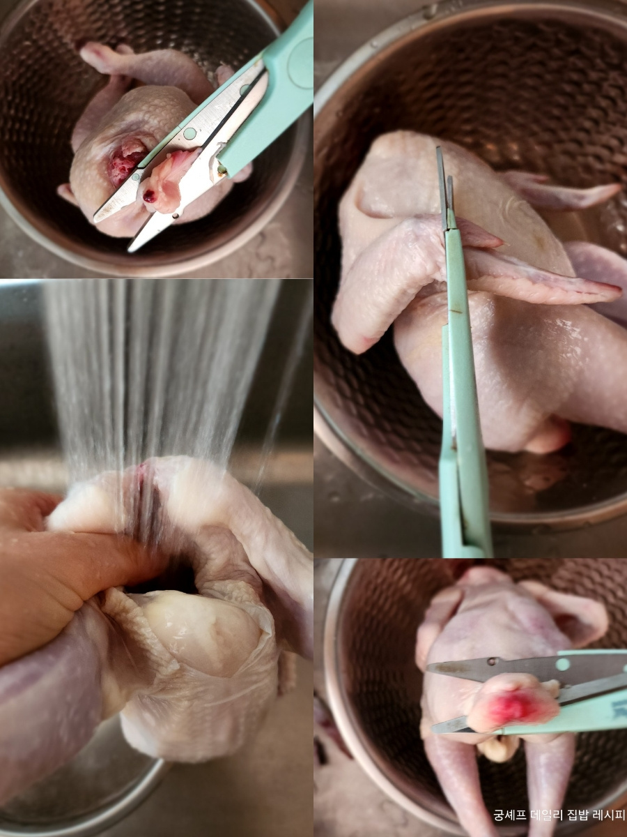꼬리, 날개 끝부분, 목덜미 기름기도 제거해 주고, 등뼈 이물질, 핏덩이를 깨끗이 긁어내 주세요.
