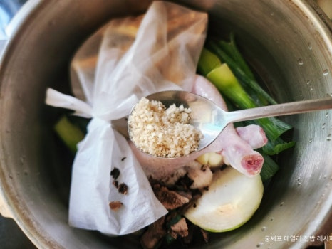 압력밭솥에 남은 찹쌀을 밑에 깔아주고 그 위에 닭을 올리고,