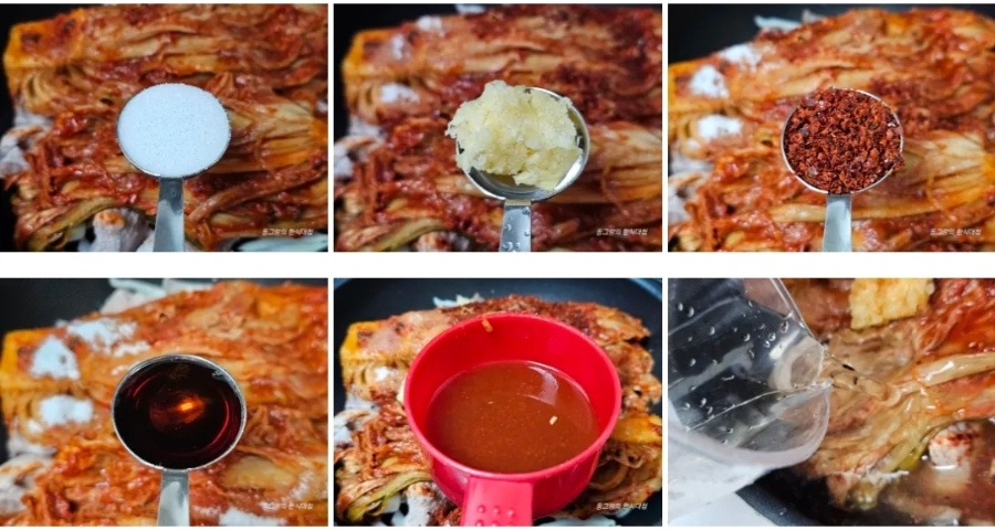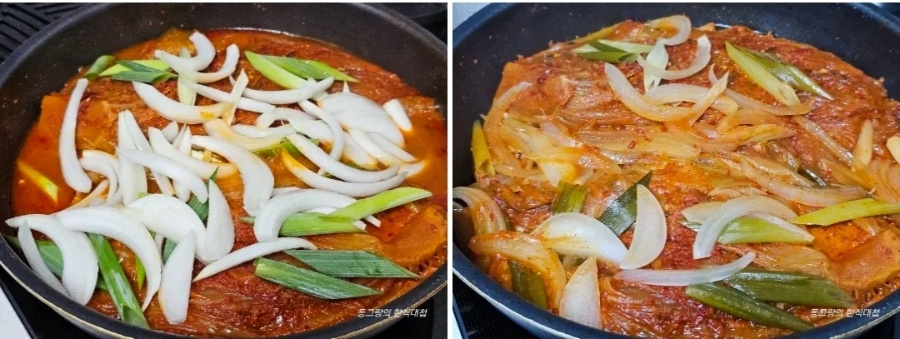 이때 간은 김치 염도에 따라 다르고 끓이다 보면 맛이 우러나와 알맞은 간이 되기 때문에 싱겁다고 처음에 간을 맞추려고 하지 말고 재료가 푹 익으면 맛보고 가감하면 됩니다.