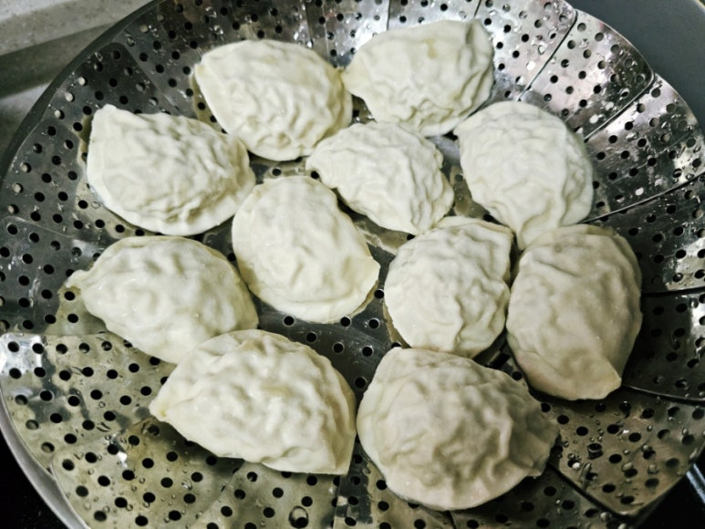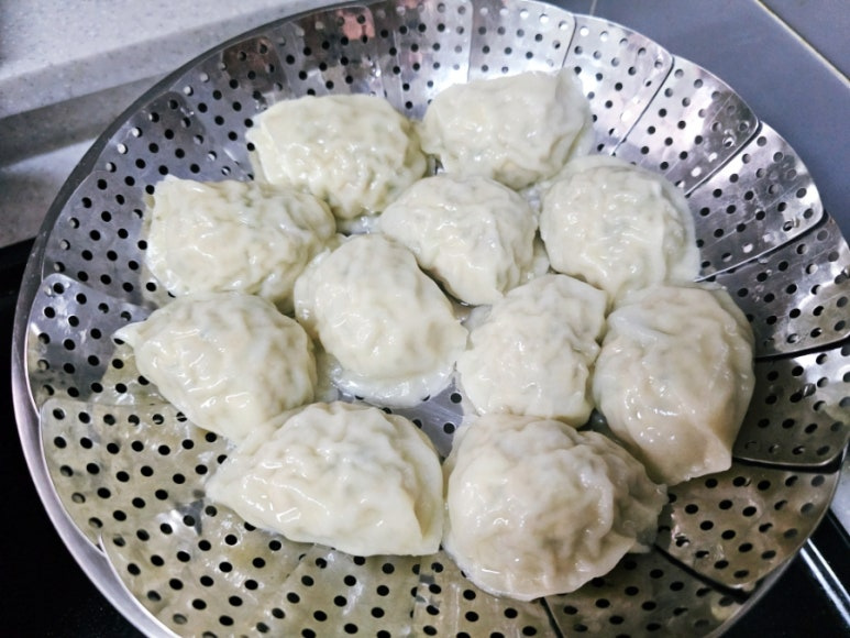 냄비 뚜껑을 열어보니 찐만두 완성 입니다.