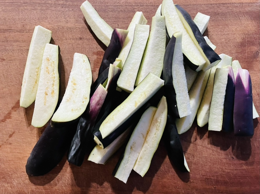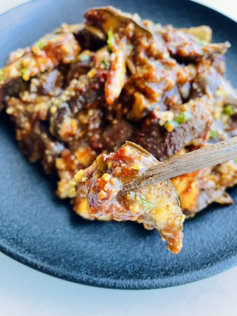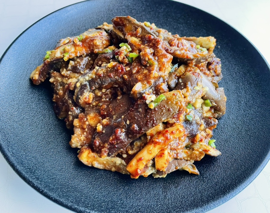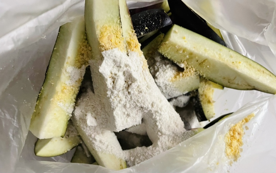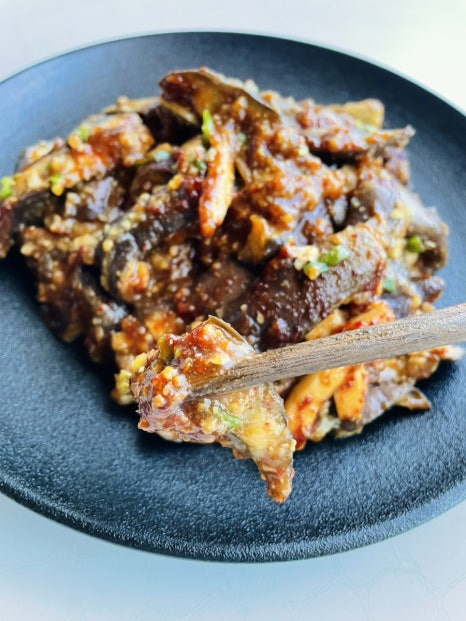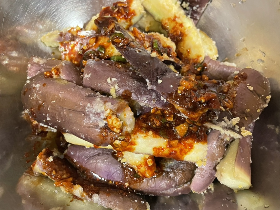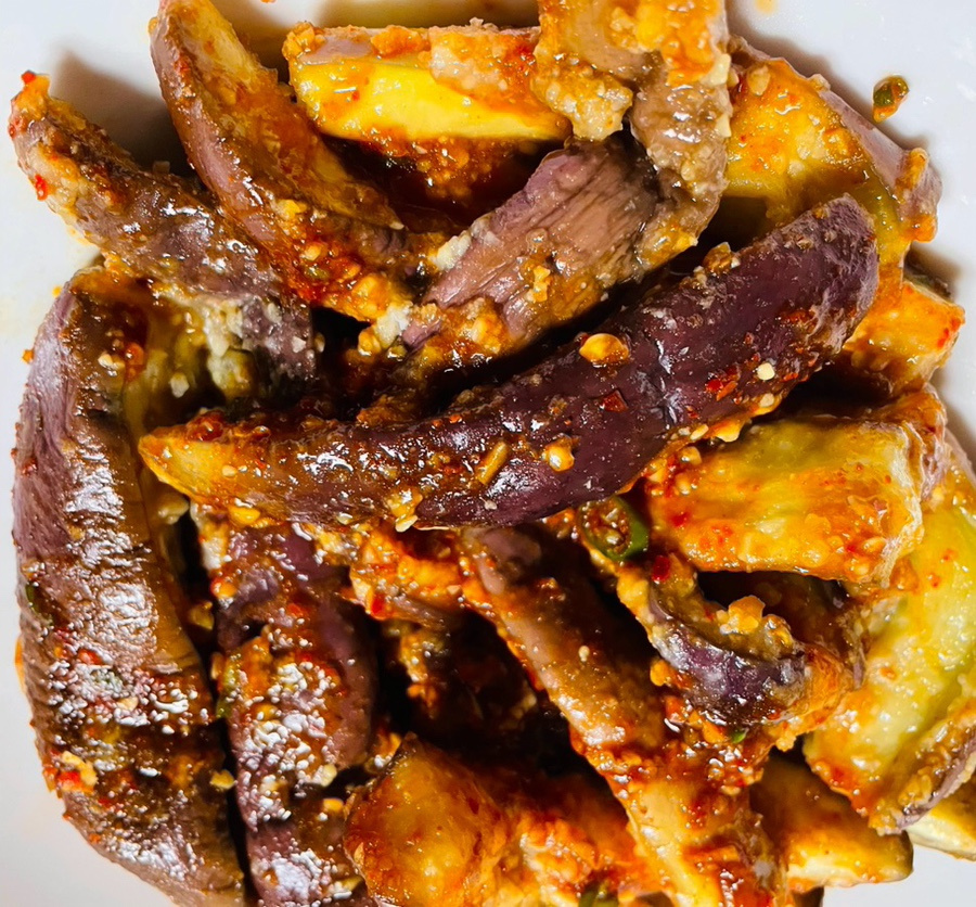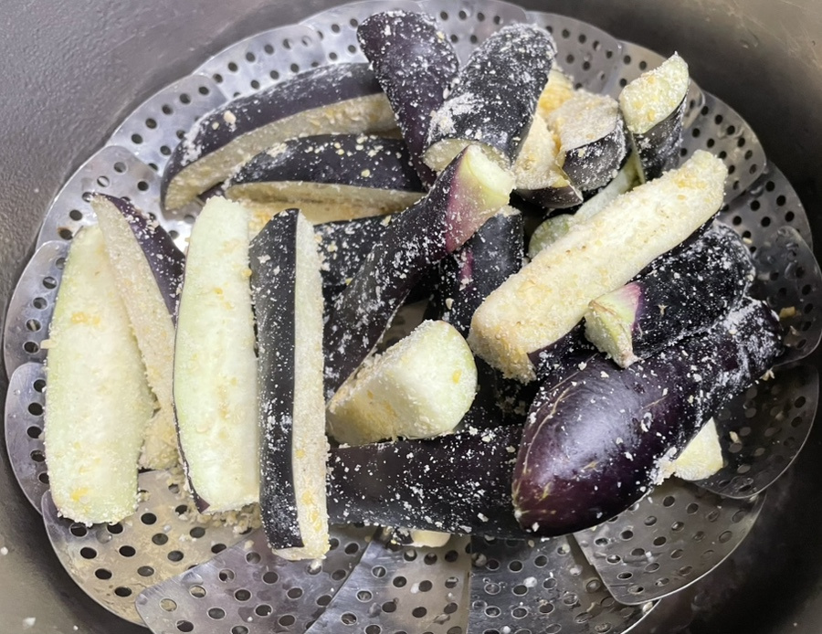 가지를 썰어 날콩가루와 찹쌀가루를 입혀 찜기에 쪄서 양념에 버무렸더니 정말 너무 맛있더라구요.