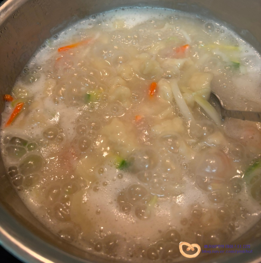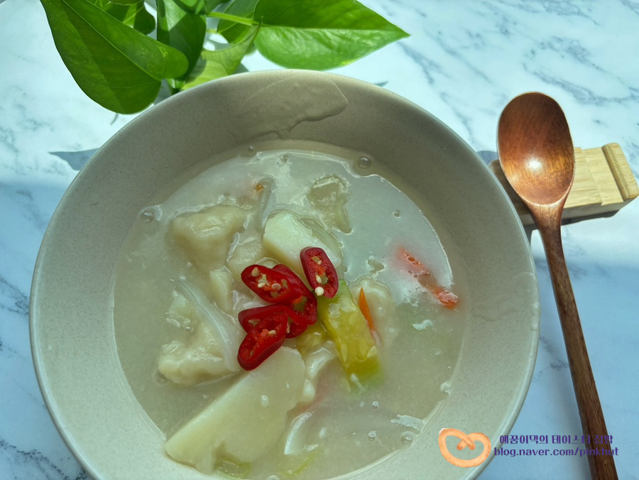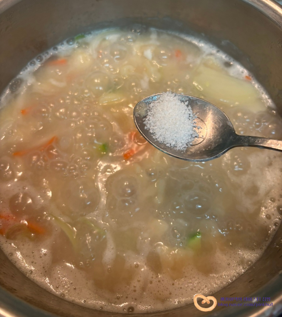 수제비가 익었으면 당근, 애호박, 양파, 대파를 넣고 끓여주고 맛을 봐서 부족한 간은 소금을 넣어 맞춰주세요. 저는 1/2T 정도 추가했어요