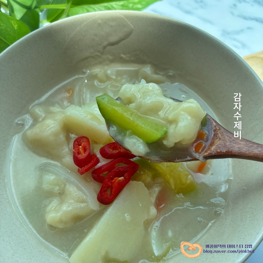 들러붙지 않게 중간중간 숟가락으로 저어주고요 보글보글 끓이다가 사진처럼 수제비가 둥둥 떠오르기 시작하면 수제비가 익은 거예요
