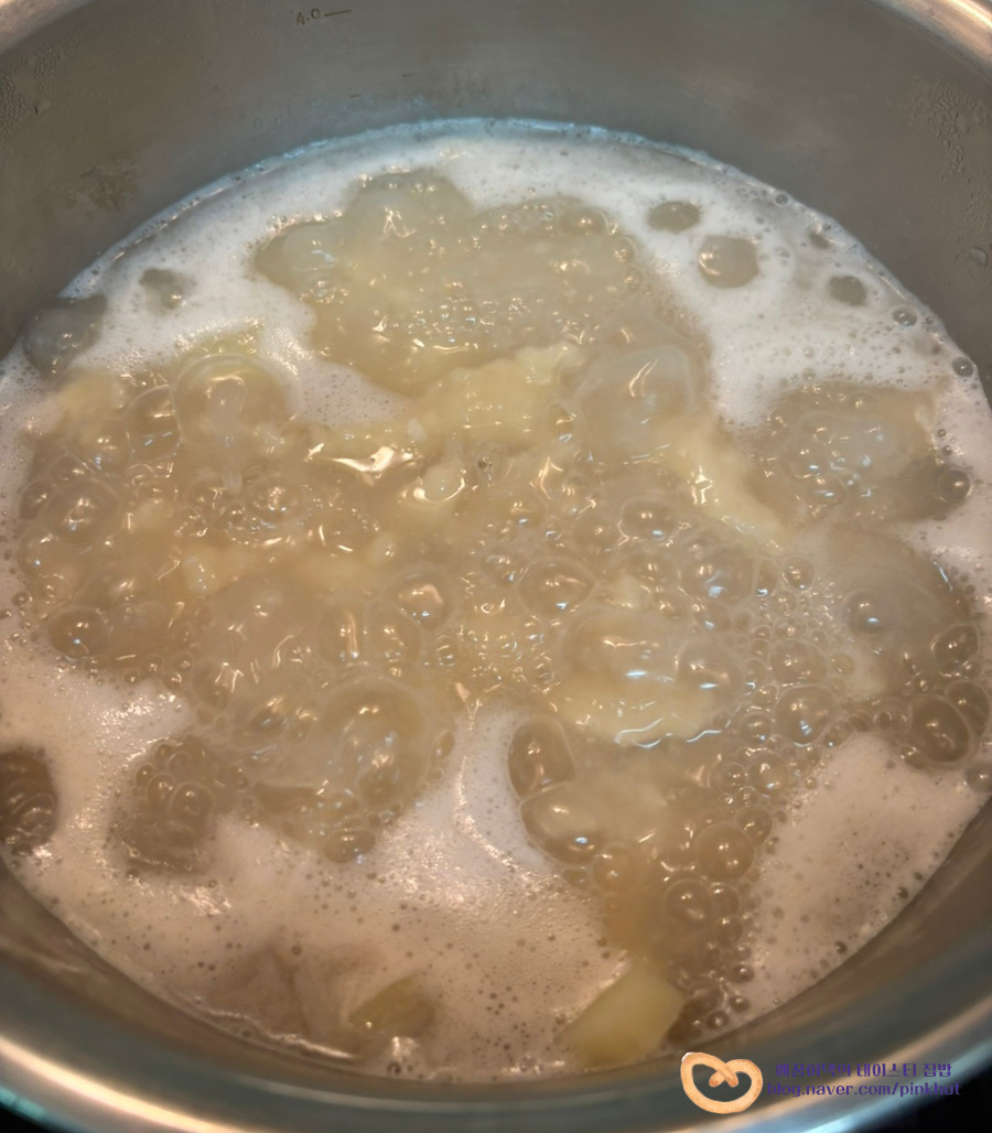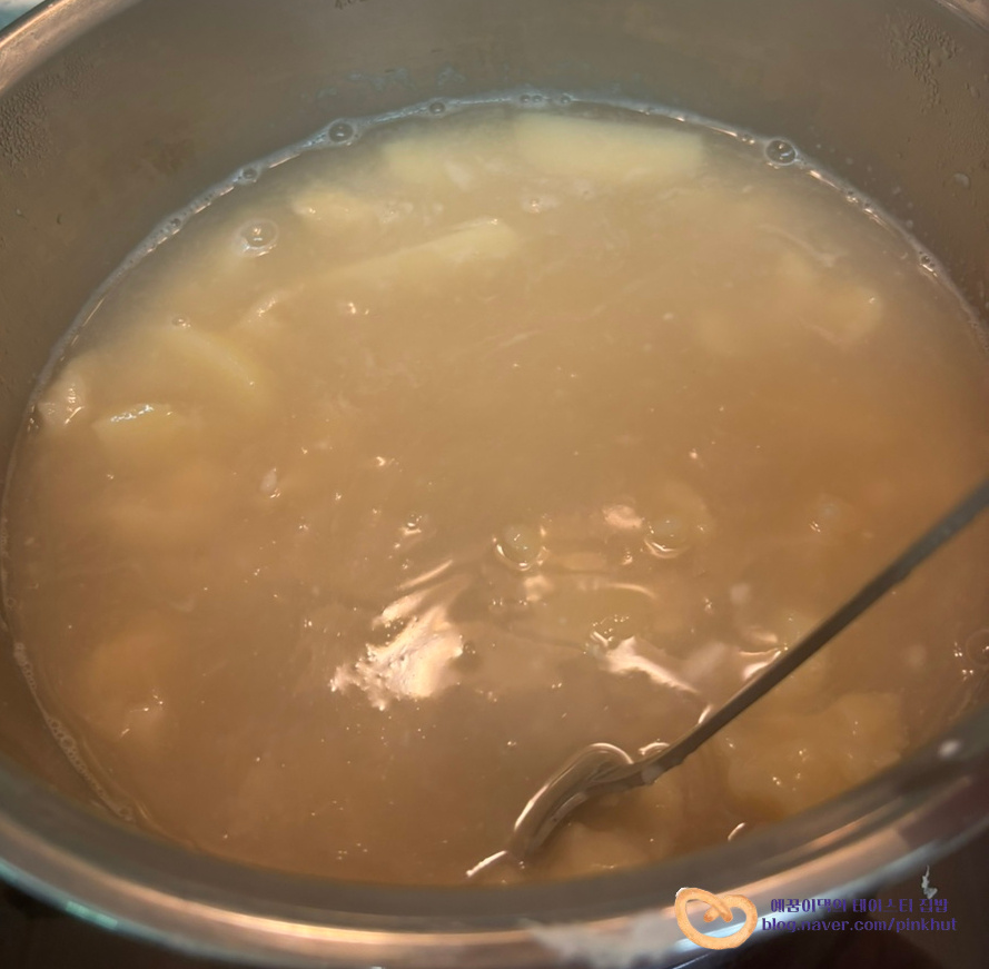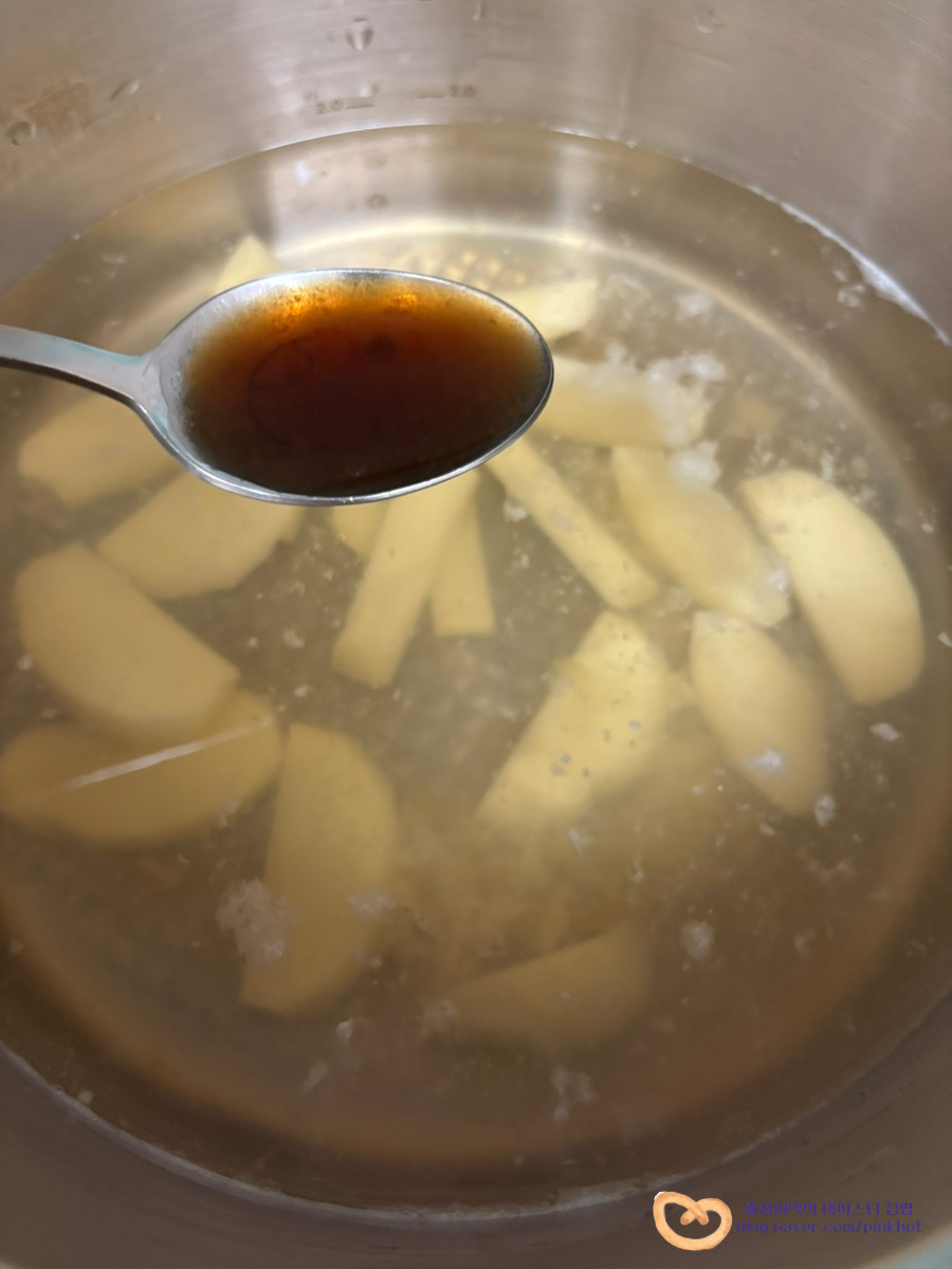 냄비에 멸치다시마 육수 1.5L를 붓고 감자를 넣어주세요. 불을 켜고 보글보글 끓으면 다진마늘 1T, 국간장 2T, 참치액 1T을 넣어 밑간을 해 주고요