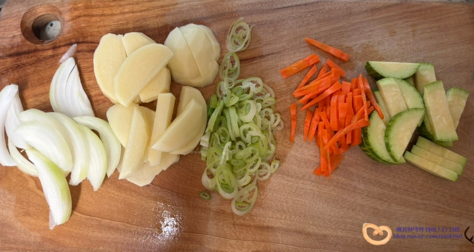 애호박 1/3개, 감자 1개는 0.8cm 두께로 썰어줍니다. 반달모양이나 채 썰어서 준비해 주시면 되는데 너무 얇지 않게 썰어야 야채가 부서지지 않아요