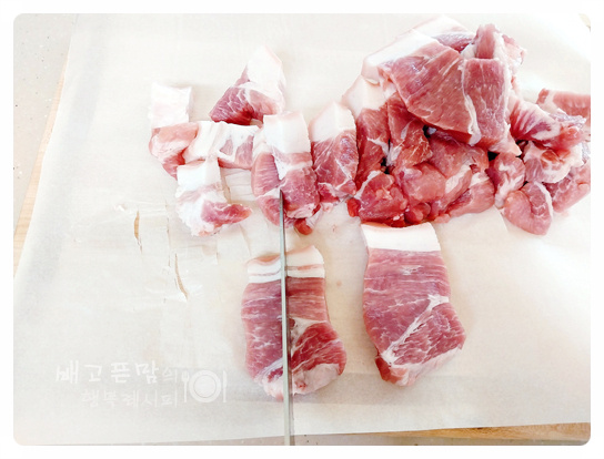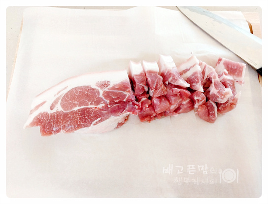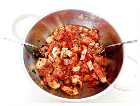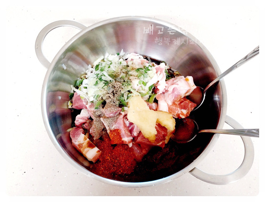 냄비에 자른 돼지 앞다리 살을 담고 간장 6 큰 술, 고춧가루 1+1/2 큰 술, 고추장 1 큰 술, 다진 마늘 2 큰 술, 생강청 2 큰 술, 청주 3 큰 술, 매실청 2 큰 술, 올리고당 1 큰 술, 후추 1 작은 술, 참기름 2 큰 술, 다진 대파를 넣고 고르게 버무려 재워 주었습니다.