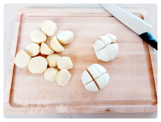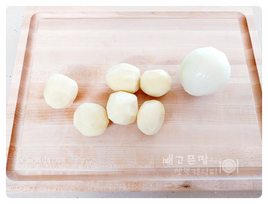 작은 알 감자 6개, 양파 1 개를 준비해 껍질 벗긴 감자는 반으로 자르고 양파는 큼직하게 네모나게 잘라 주었습니다.