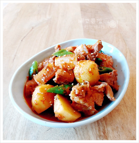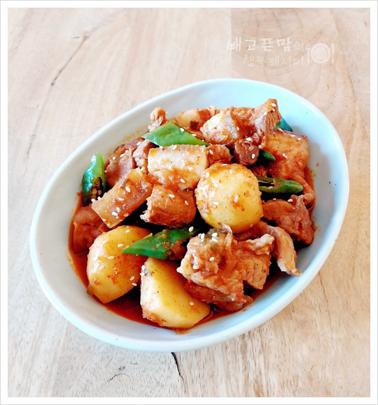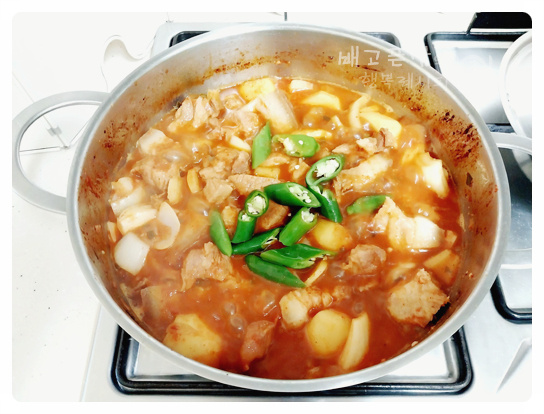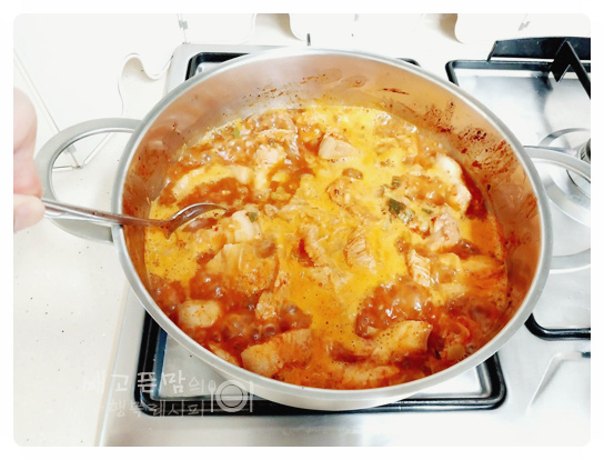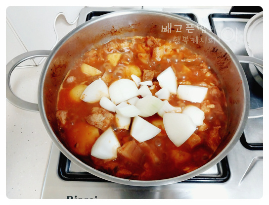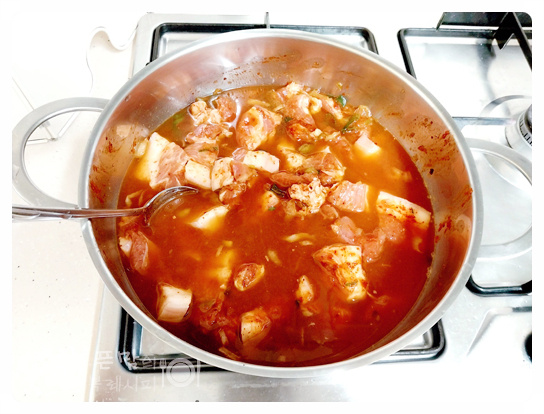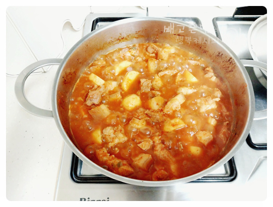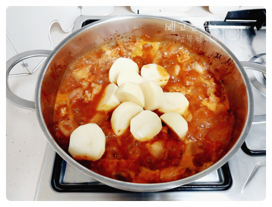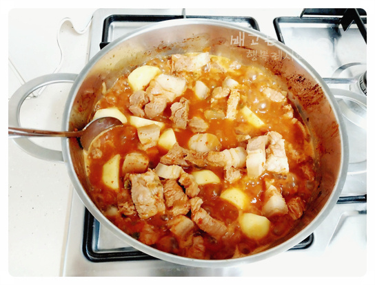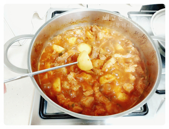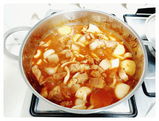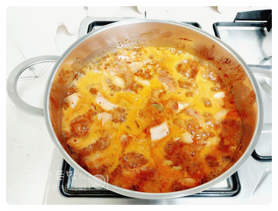 센 불에서 고르게 한번 끓으면 중 불로 줄여 끓여 줍니다.