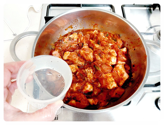 양념에 재운 고기에 물 2컵을 붓고 고르게 저어 센 불에서 끓여 줍니다.