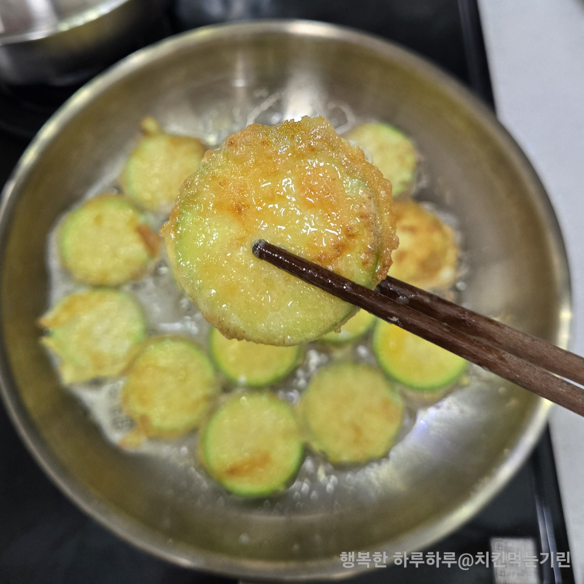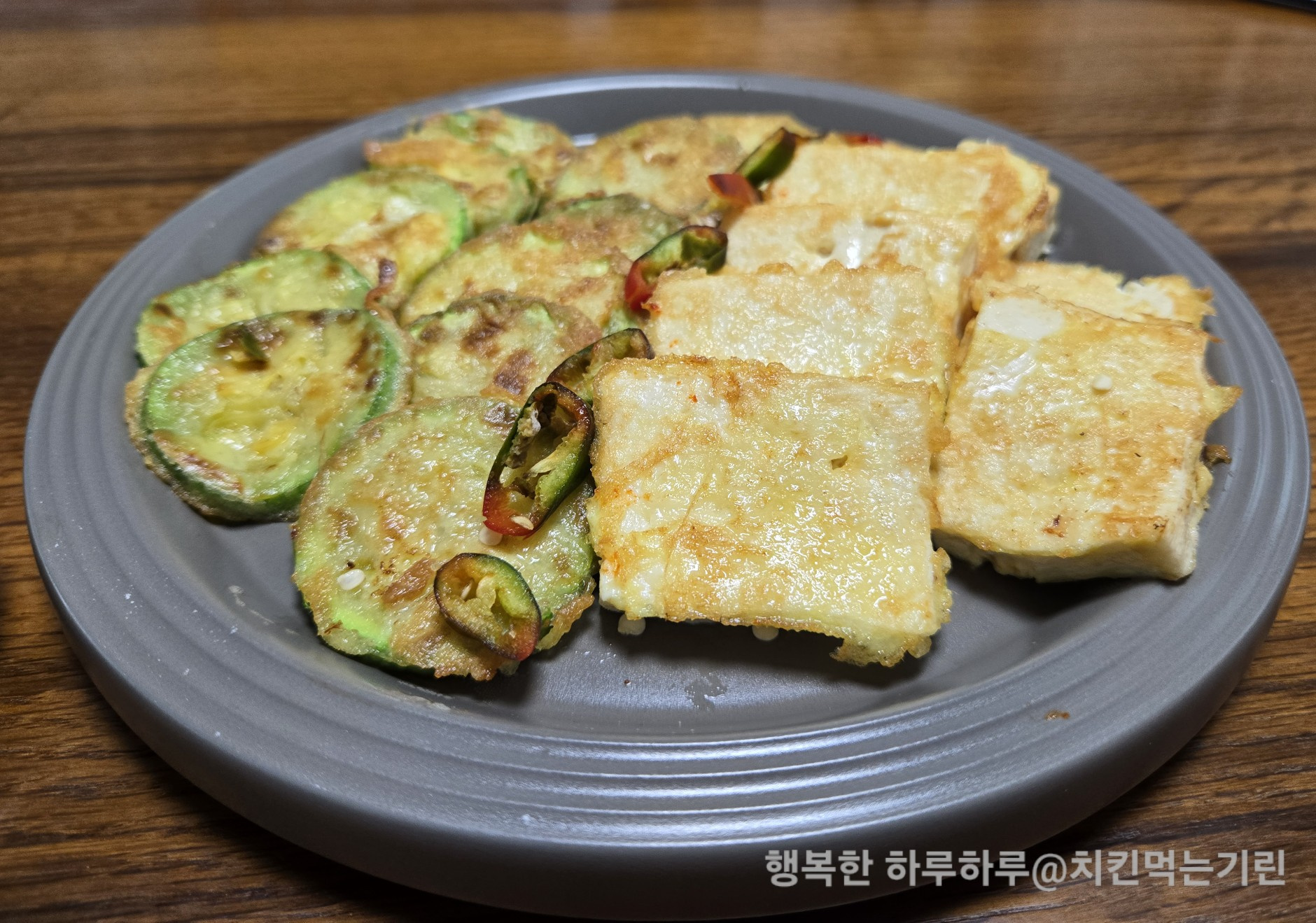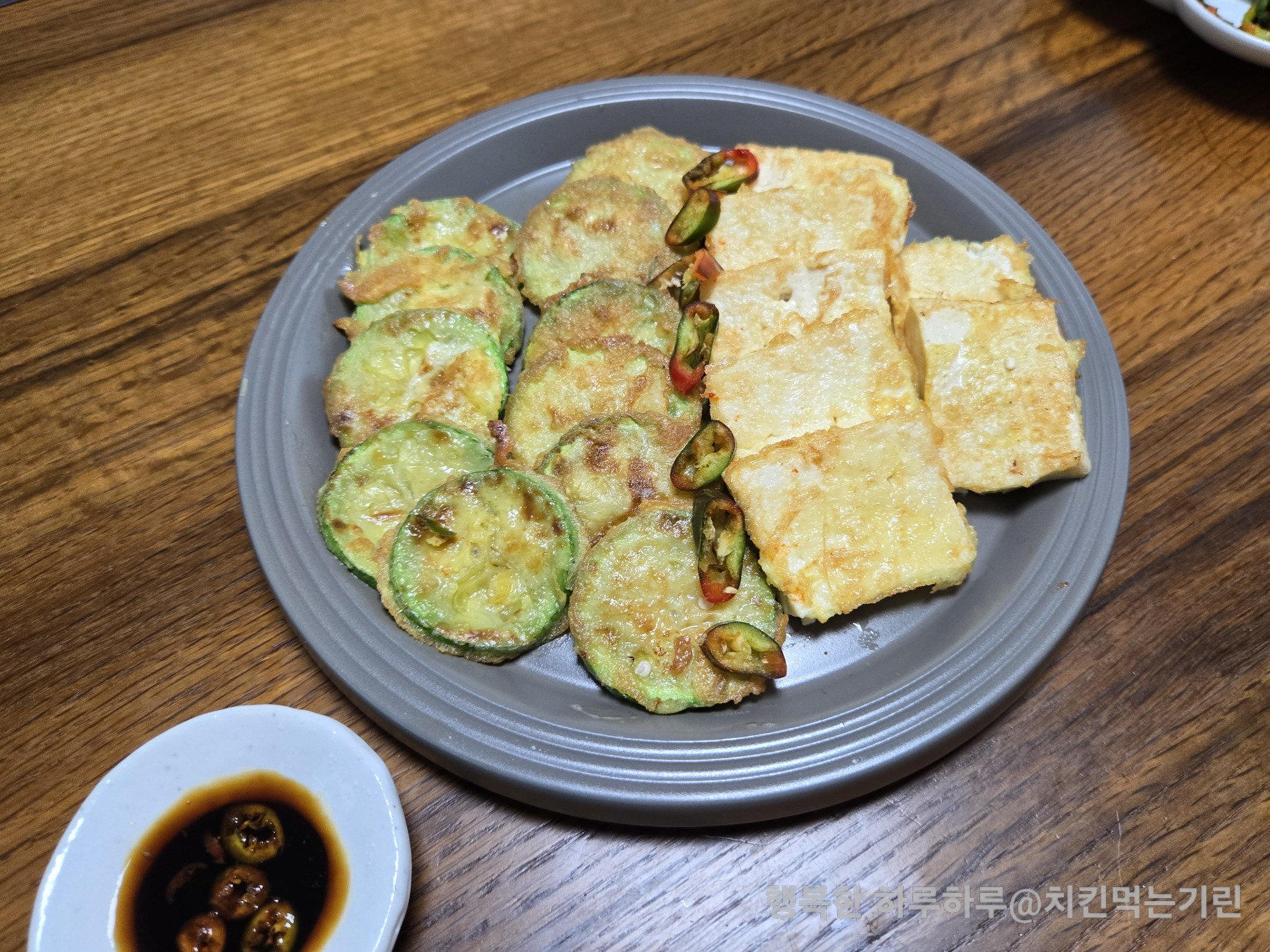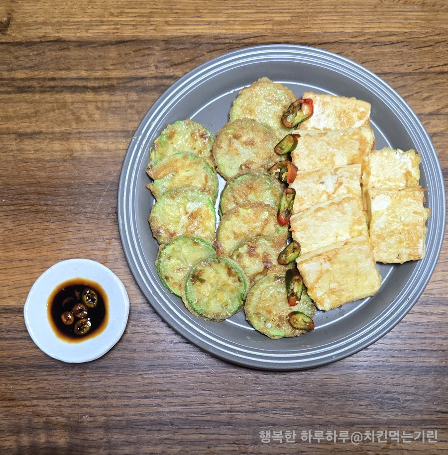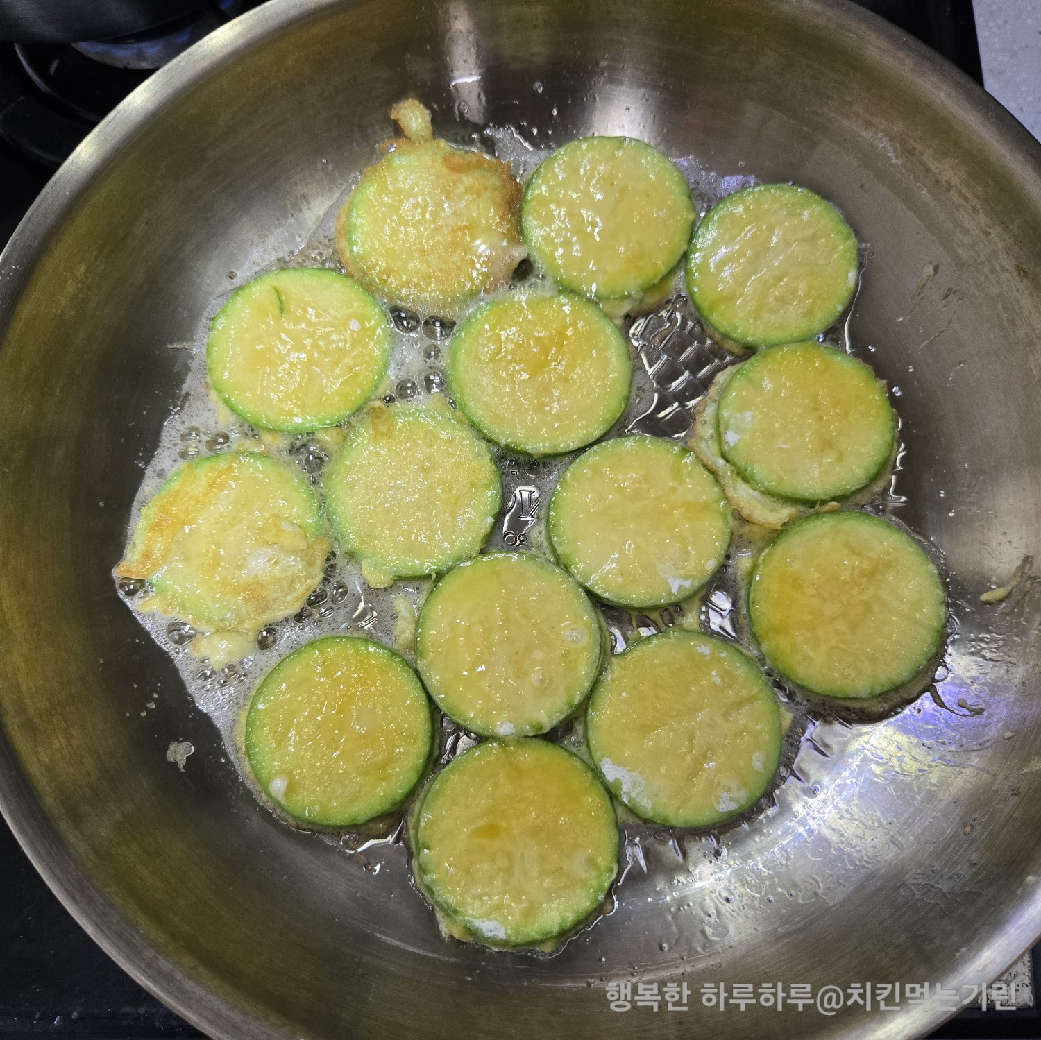 호박도 동일하게 부침가루를 살짝 붙힌 뒤 달궈진 팬에 올려 부쳐줍니다.