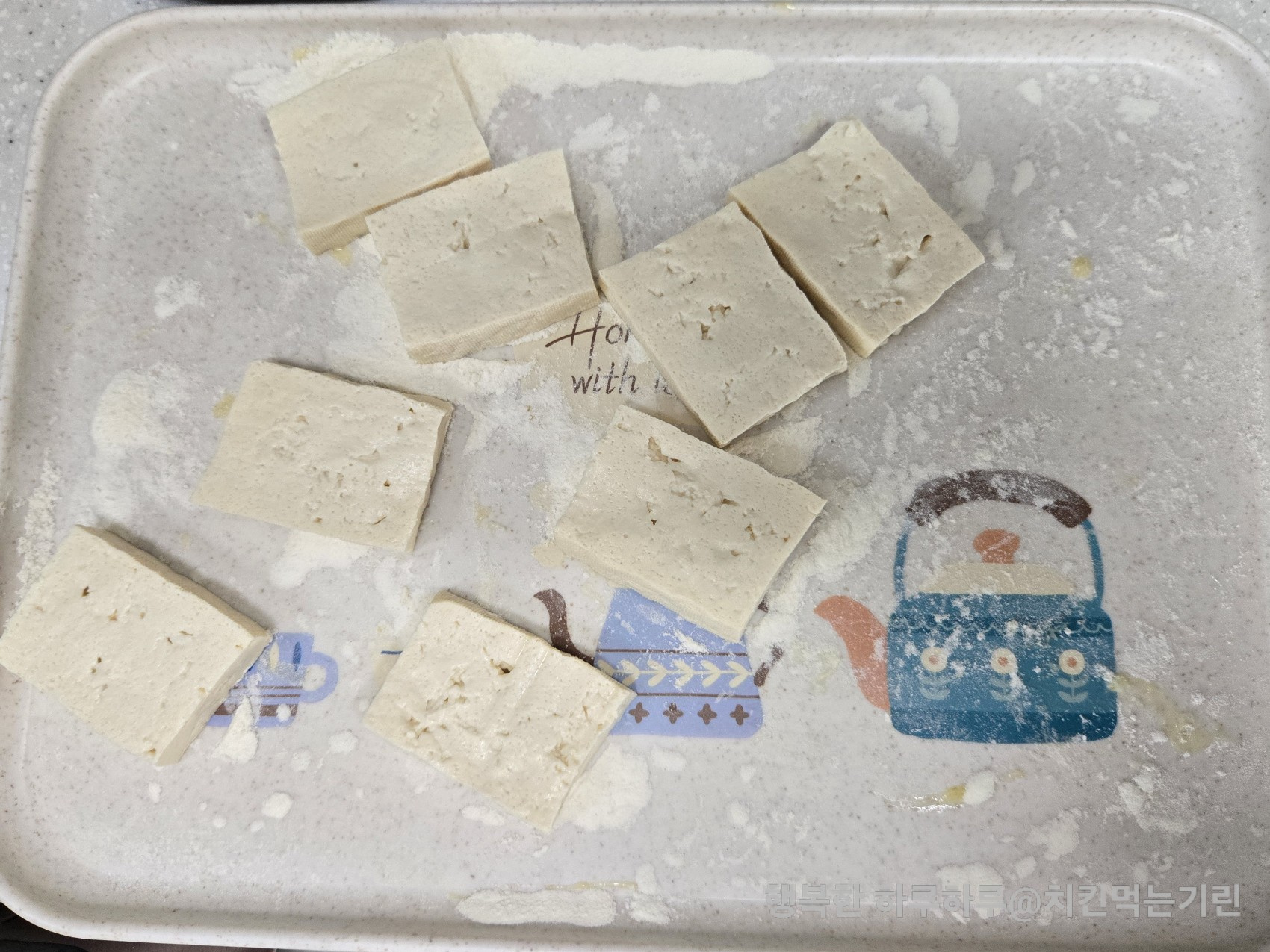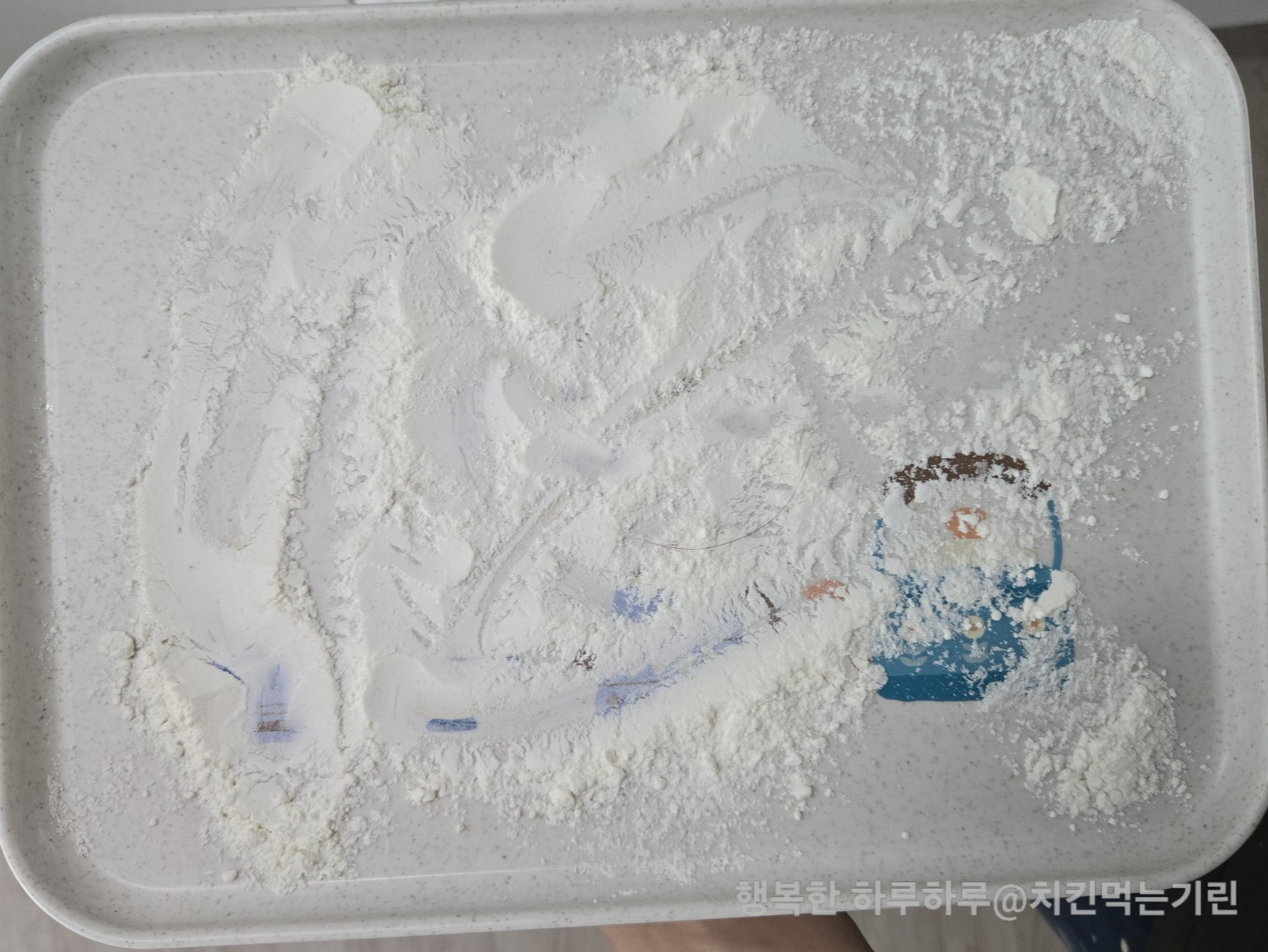 부침가루를 가볍게 뭍힌 뒤 쟁반위에서 톡톡 털어줍니다.