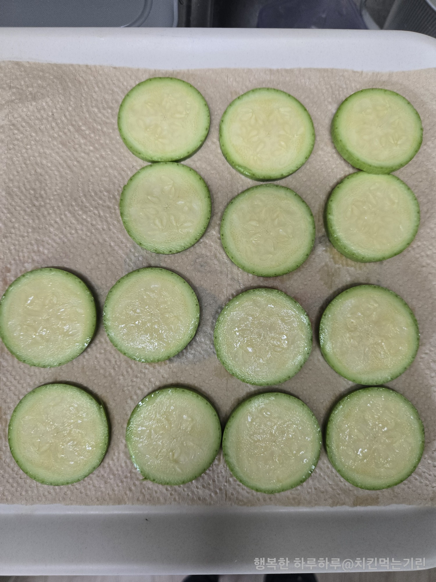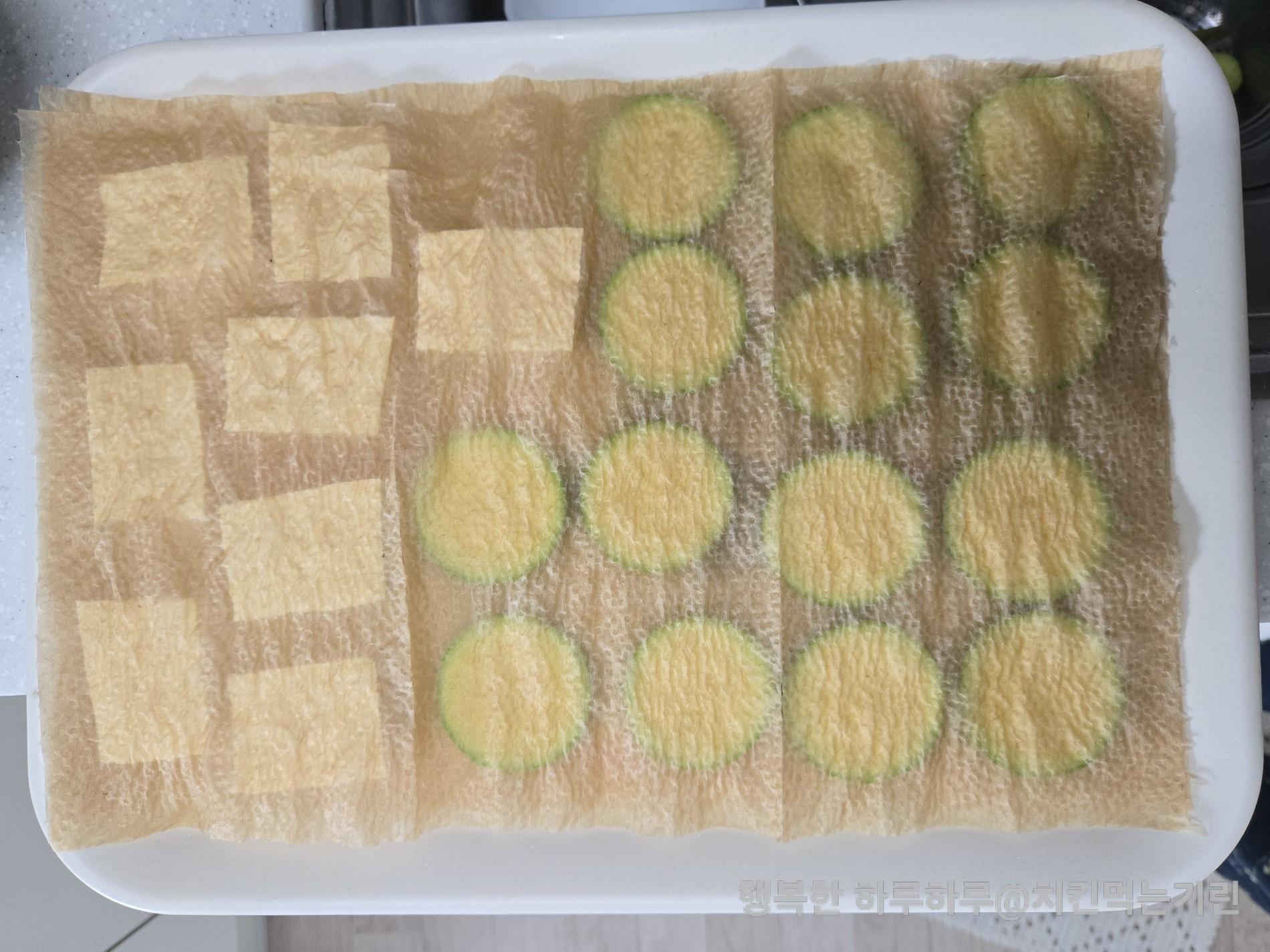 가장 중요한 단계입니다. 전부칠재료를 쟁반에 한데 모아 키친타올을 덮어 수분을 제거해 줍니다.