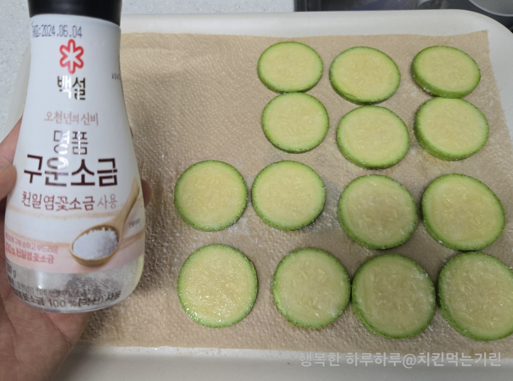 재료에 간을 할겸 소금을 뿌려주면 재료 내부의 수분이 빠져나와 좀 더 쉽게 제거할 수있습니다.