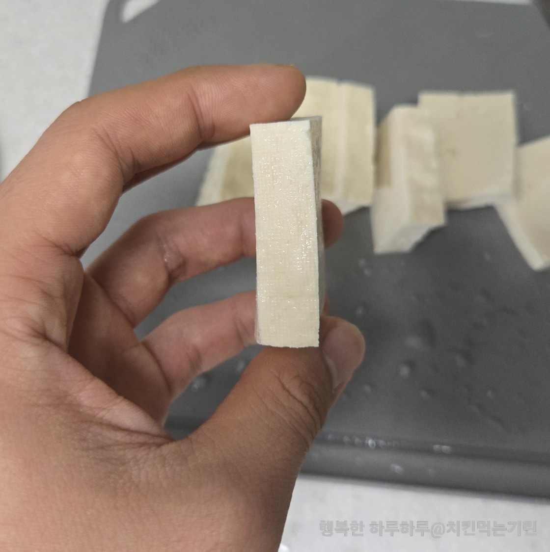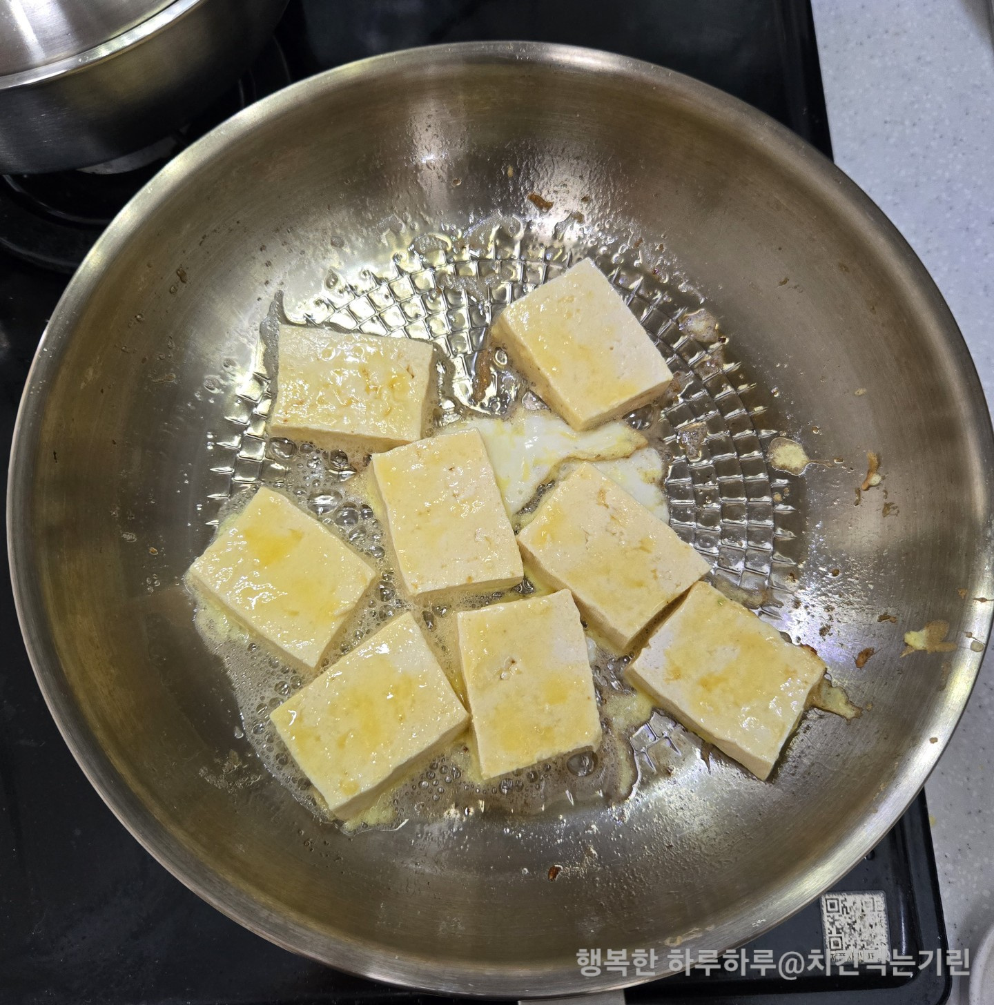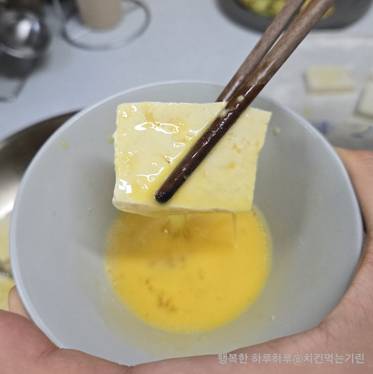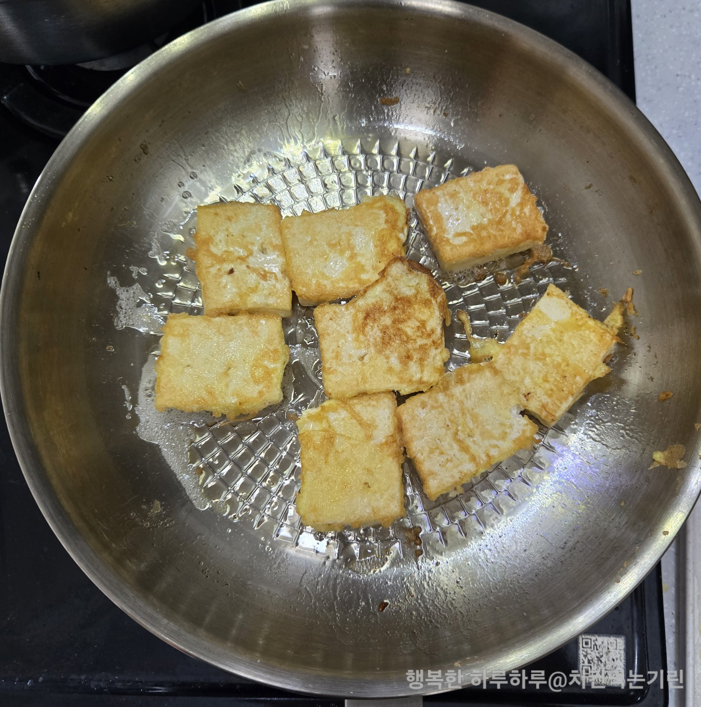 두부옆으로 흘러내린 계란이 익을때 쯤 노릇해졌는지 확인하고 뒤집어 줍니다.