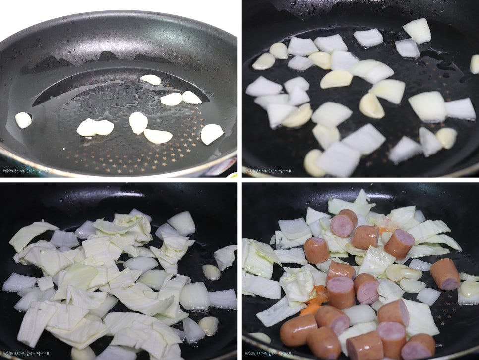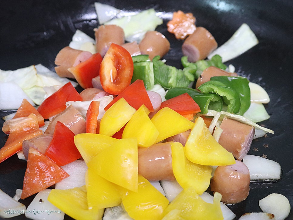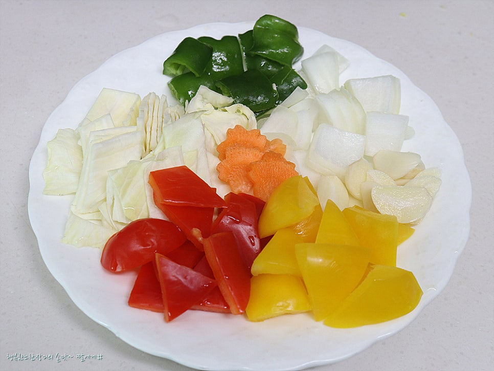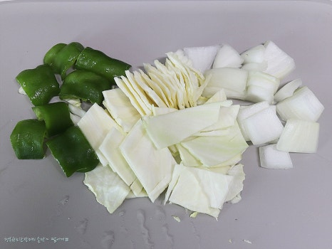 양배추, 양파, 아삭이고추 같은 크기로 썰고