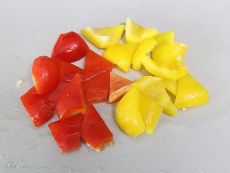 파프리카 빨강,노랑 1/4개 어슷비슷 썰고