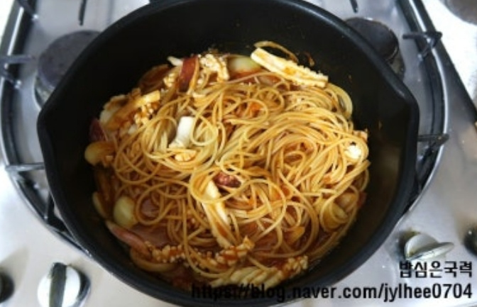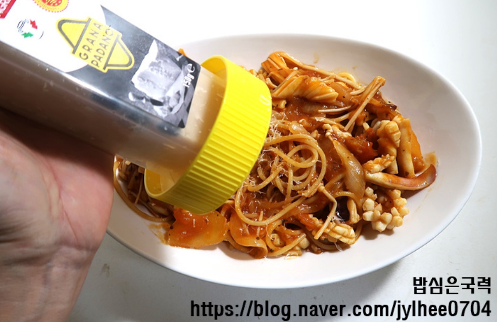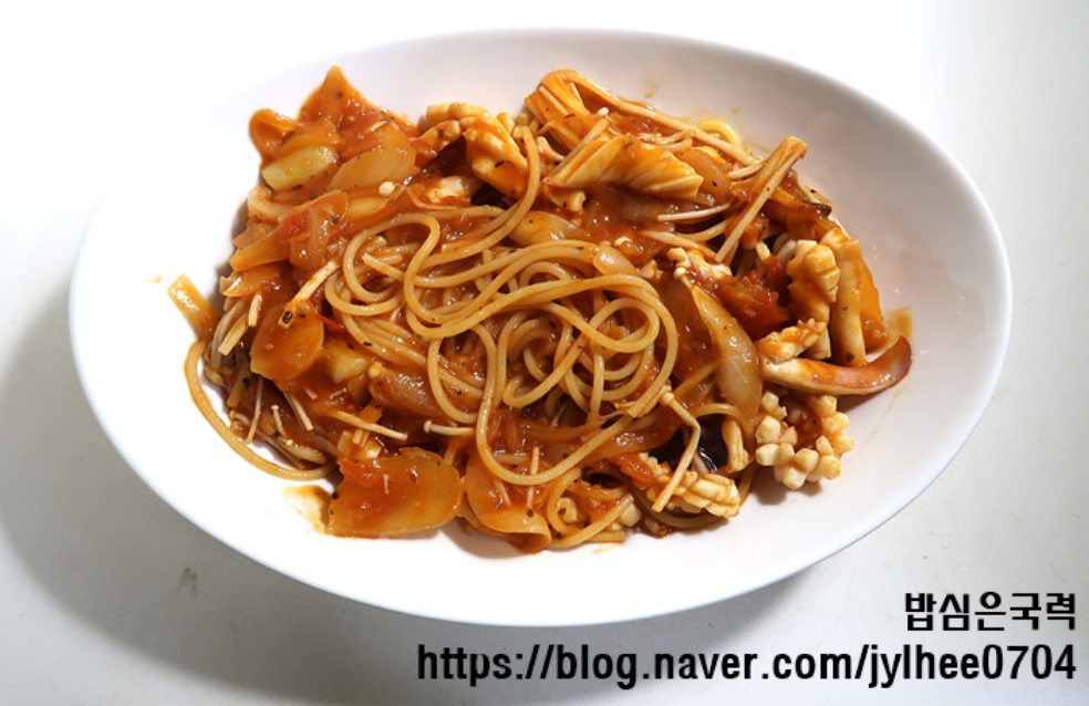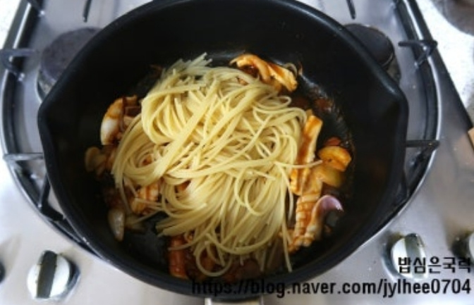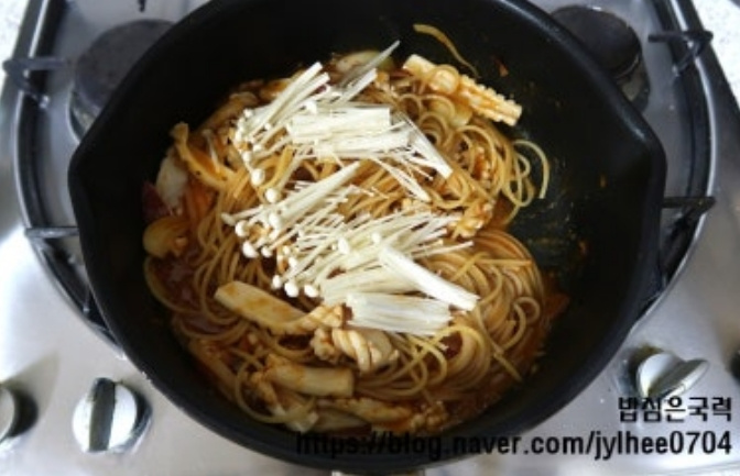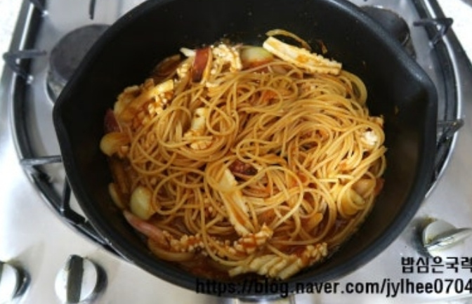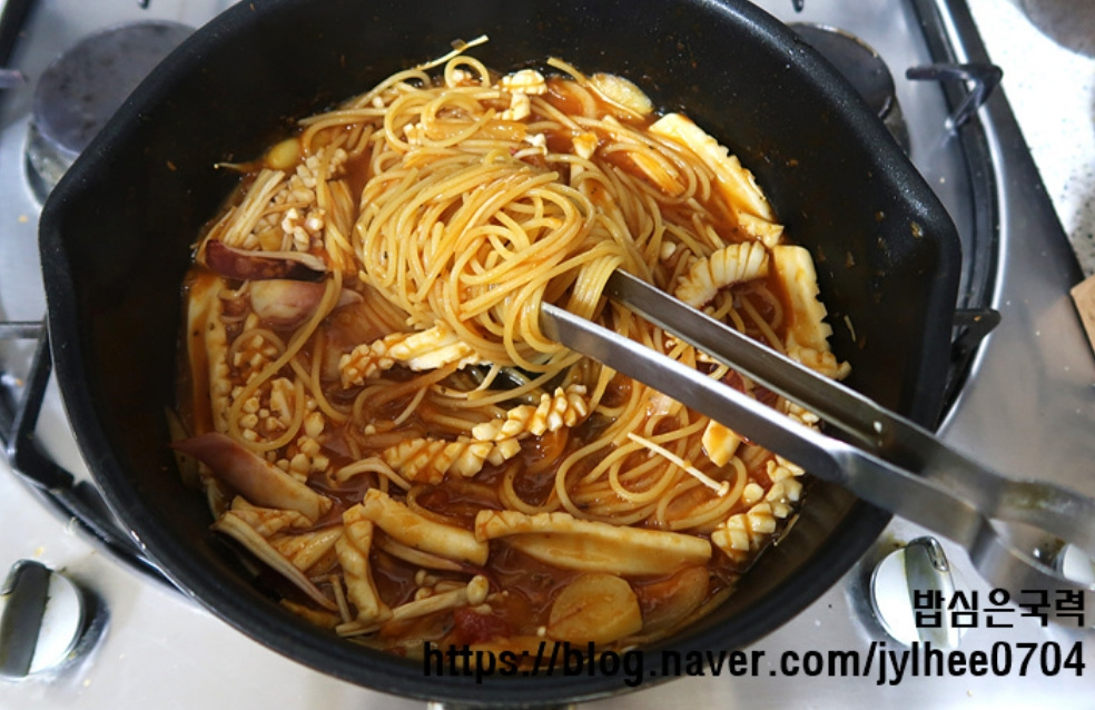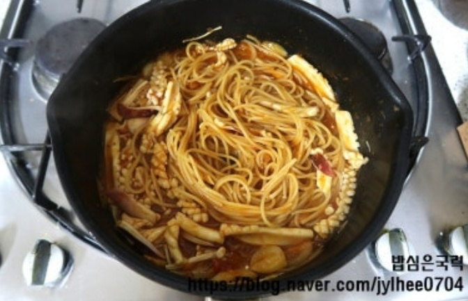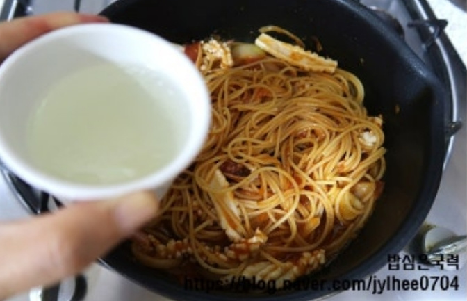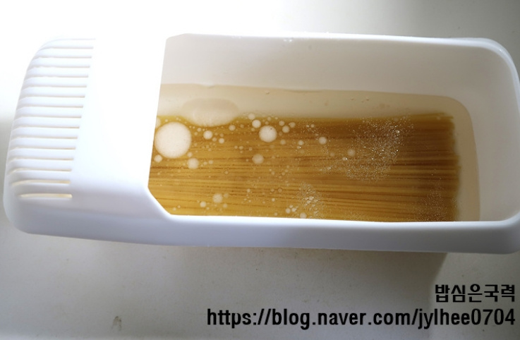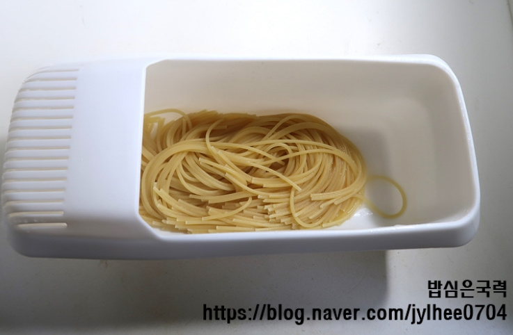 물을 따라내고 바로 만들지 않으면 여기에 올리브오일을 넣고 버무리면 면이 달라붙지 않아요.