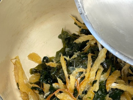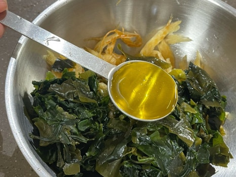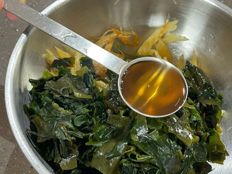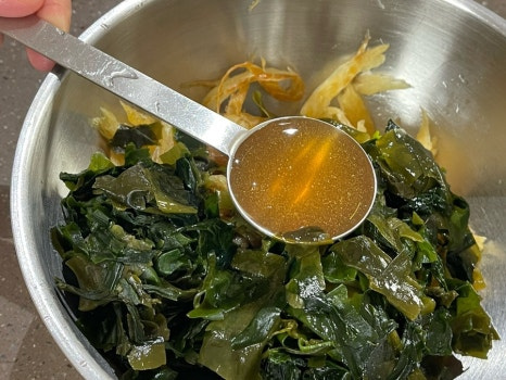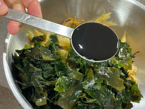 손질한 미역과 북어는 물기를 제거한 뒤 볼에 한번에 담아 준 뒤 국간장 1T, 참치액 1T, 멸치액젓 1T, 들기름 2T, 간마늘 1T을 넣어 조물조물 버무려주세요.