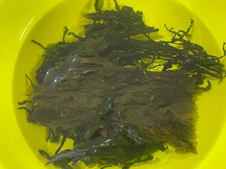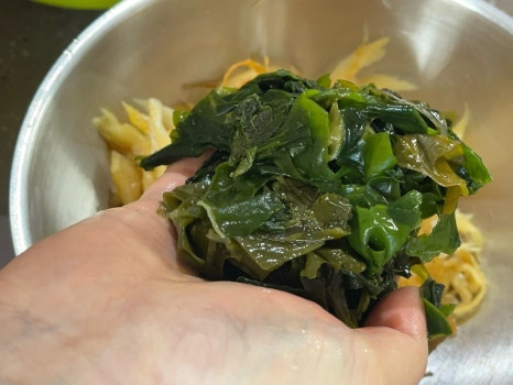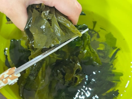 불린 미역은 흐르는 물에 씻어 물기를 뺀 뒤 가위나 칼을 사용해 먹기 좋은 크기로 썰어 주세요.
