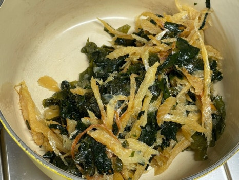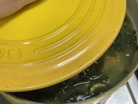 10분 정도 재워 둔 뒤 큰 냄비에 미역과 북어를 넣고 물 500ml를 넣어 뚜껑 덮고 약불로 15분 동안 푹 끓여 주세요.