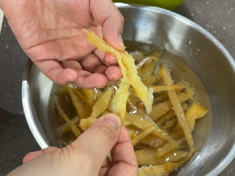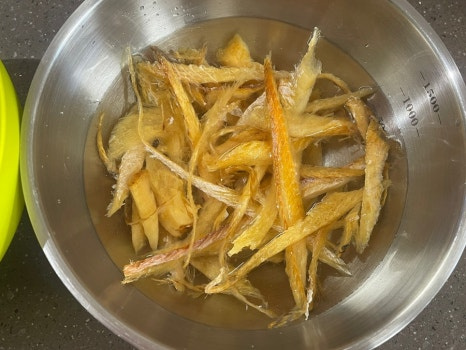 불에 불린 북어는 물기를 제거한 뒤 손으로 찢거나 가위로 썰어 주세요.