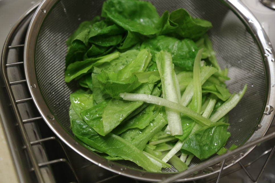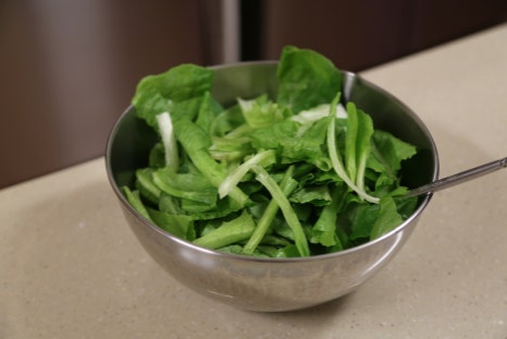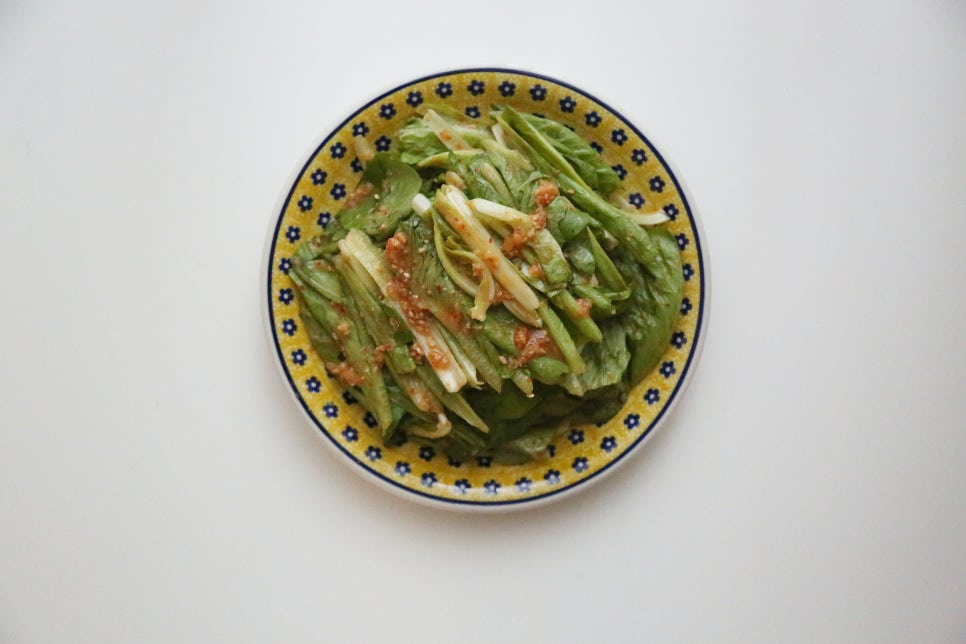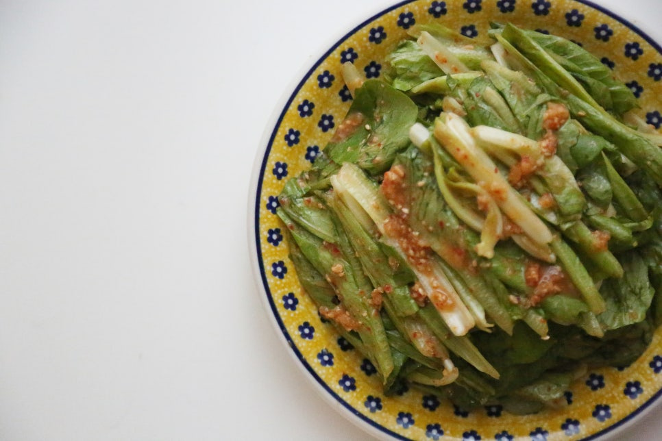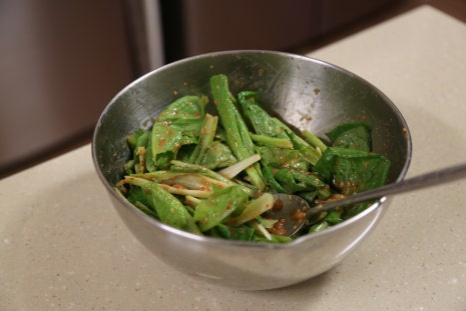 쌈채소의 싱싱함을 오래 유지하기 위해 손으로 열전달없이 수저로 고루 섞어가면서 무쳐준다