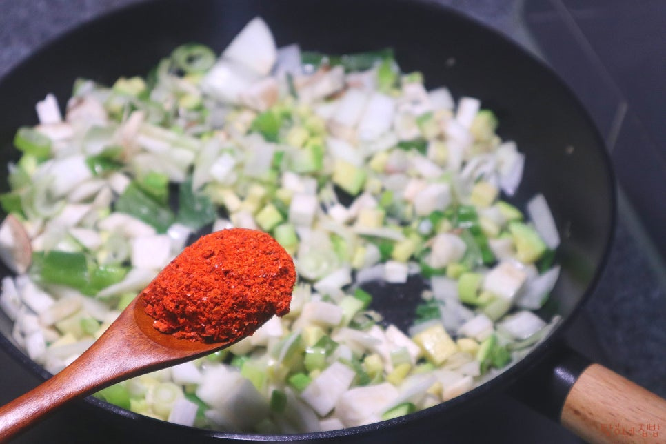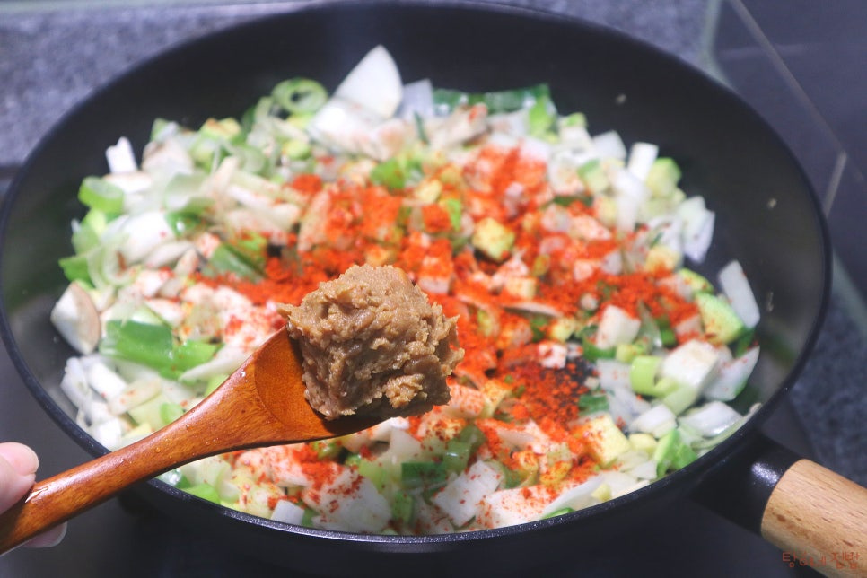 된장만 쓰면 텁텁해질 수 있어 고추장이나 고춧가루를 조금 섞어주면 칼칼하니 더 맛나답니다.