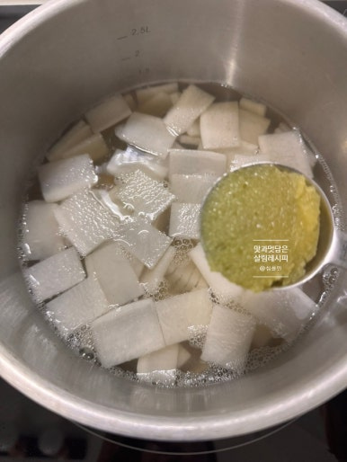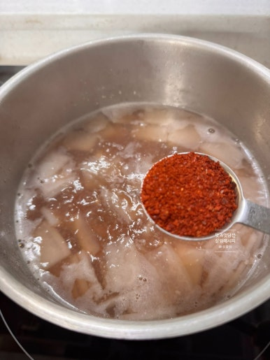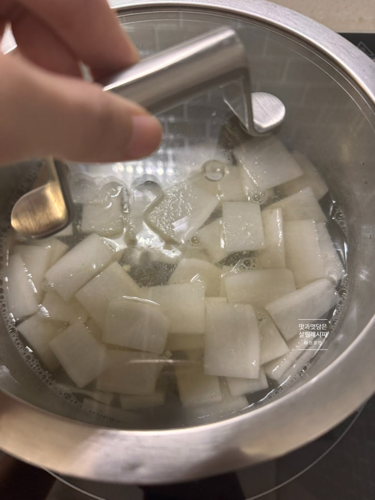 나박 썰기 한 무부터 넣고 시원한 맛 살려줍니다. 무와 함께 다진 마늘도 1큰술 넣어주세요.