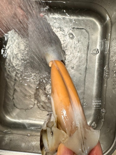 손질되지 않은 상태로 말끔하게 내장 손질부터 들어갈게요. 먼저 위와 같이 한 손은 몸통 부분 다른 한 손을 다리 부분을 잡고 당겨주면 손쉽게 내장 통째로 분리할 수 있는데요.