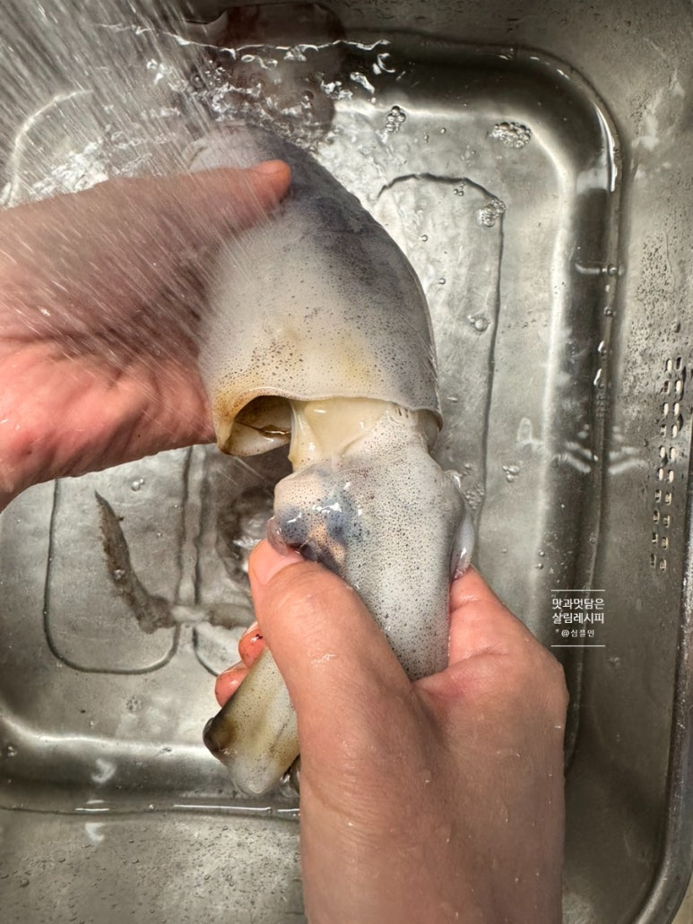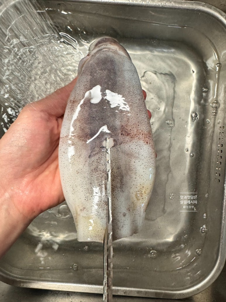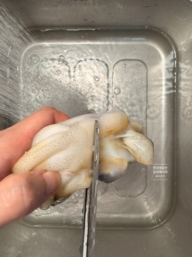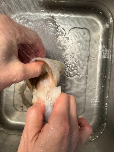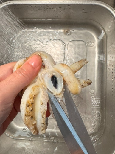 눈 부분을 기준으로 잘라 다리와 내장까지 분리하고요. 다리 가운데 사이에 있는 입 부분도 가위를 사용해 잘라 제거합니다.