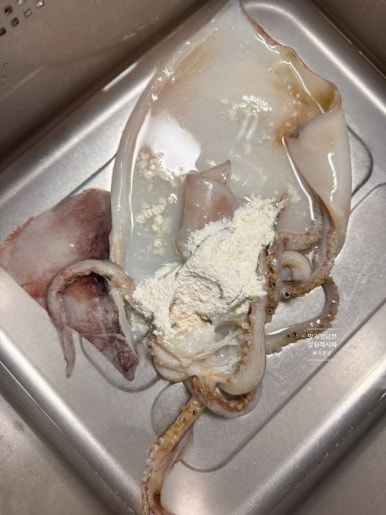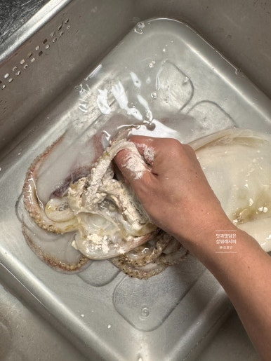 이제 깨끗하게 세척하는데요. 밀가루 한두 큰술을 뿌리고 손으로 바락바락 문질러 주면 빨판에 붙은 이물질도 제거가 잘 되면서 말끔하게 세척할 수 있어요.
