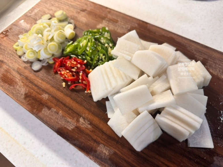 야채 손질 후 썰어주는데요. 대파 반대와 청양고추 2개, 홍고추 2개 어슷 썰어 매콤한 재료 준비했어요. 고추는 취향에 따라 양을 조절합니다. 무는 200g 한 입 쏙쏙 떠먹기 좋은 크기로 나박 썰어 주었어요.