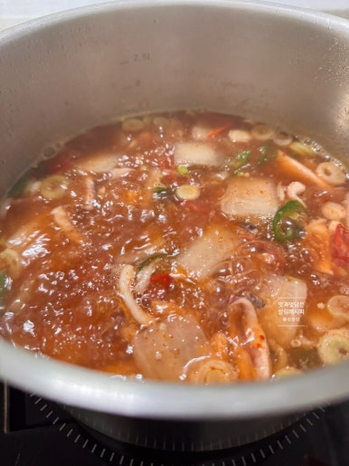 위 분량의 양념 재료 넣어주어 고춧가루로 칼칼한 맛 더해주고 참치액과 국간장으로 간도 맞추고 감칠맛도 살려줍니다. 고루 섞어주고요. 이제부터 차례로 재료 넣으면서 가볍게 끓여 과정 거쳐 마무리할게요.