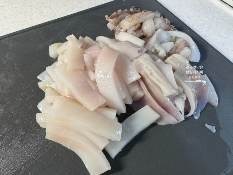 다음 손질해 둔 오징어 넣어주세요. 고춧가루 1큰술