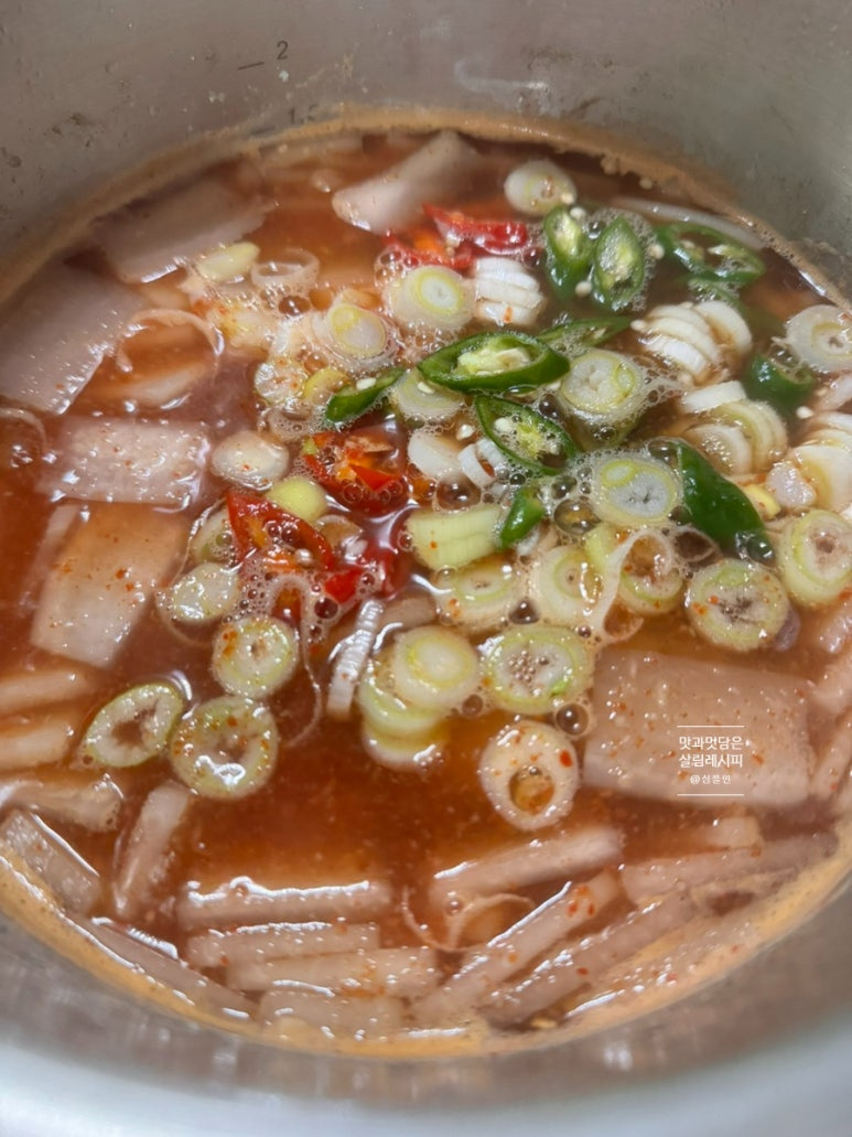 송송 썬 파와 고추 넣고 가볍게 한소끔 끓여 마무리합니다. 마무리로 맛을 보고 개인 취향에 따라 부족한 간은 소금 소량으로 맞춰주고요. 후춧가루도 소량 추가해 완성합니다.