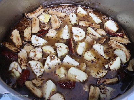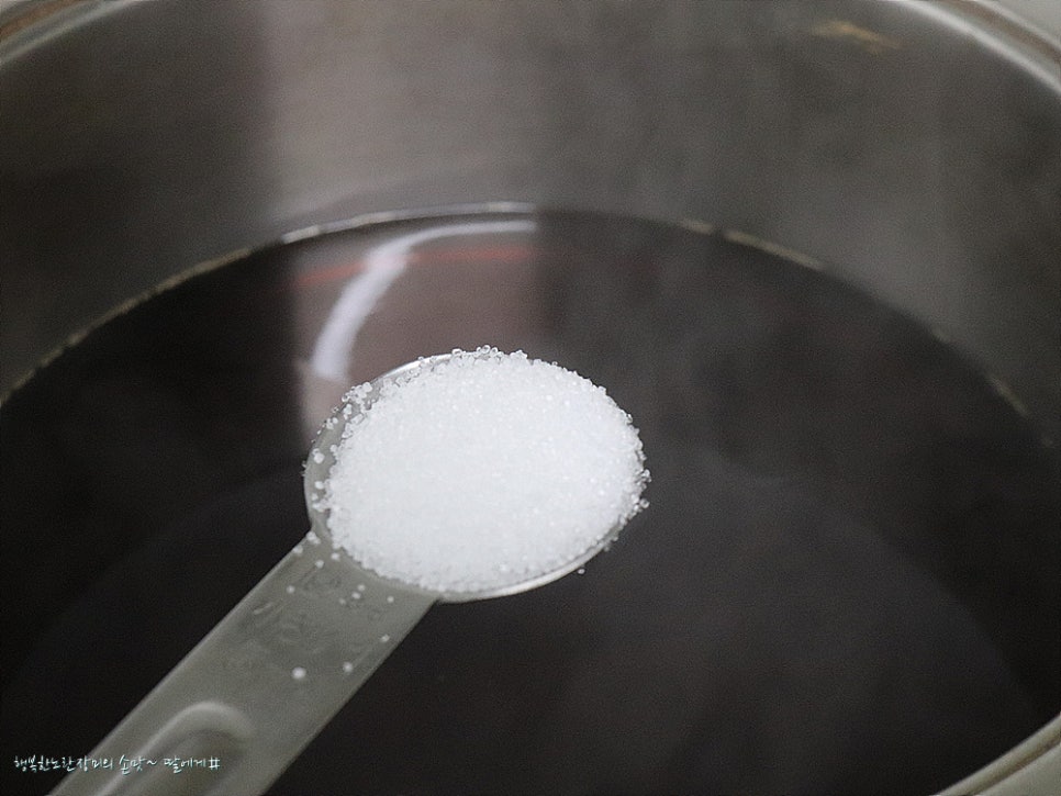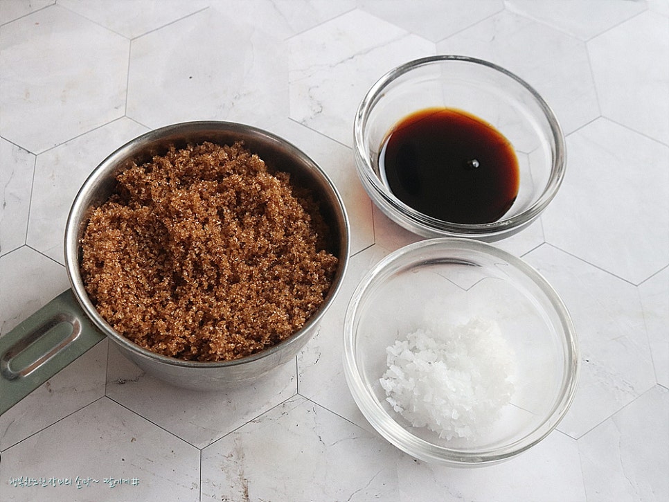 물 2컵+,흑설탕1컵, 간장1T,소금1T,