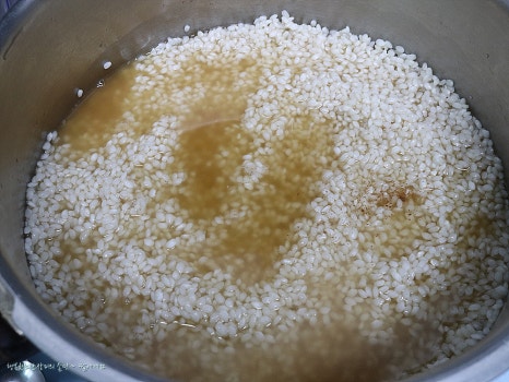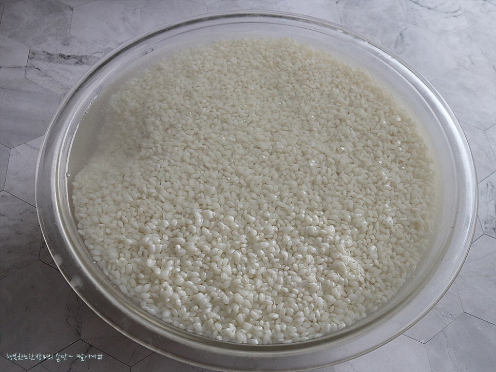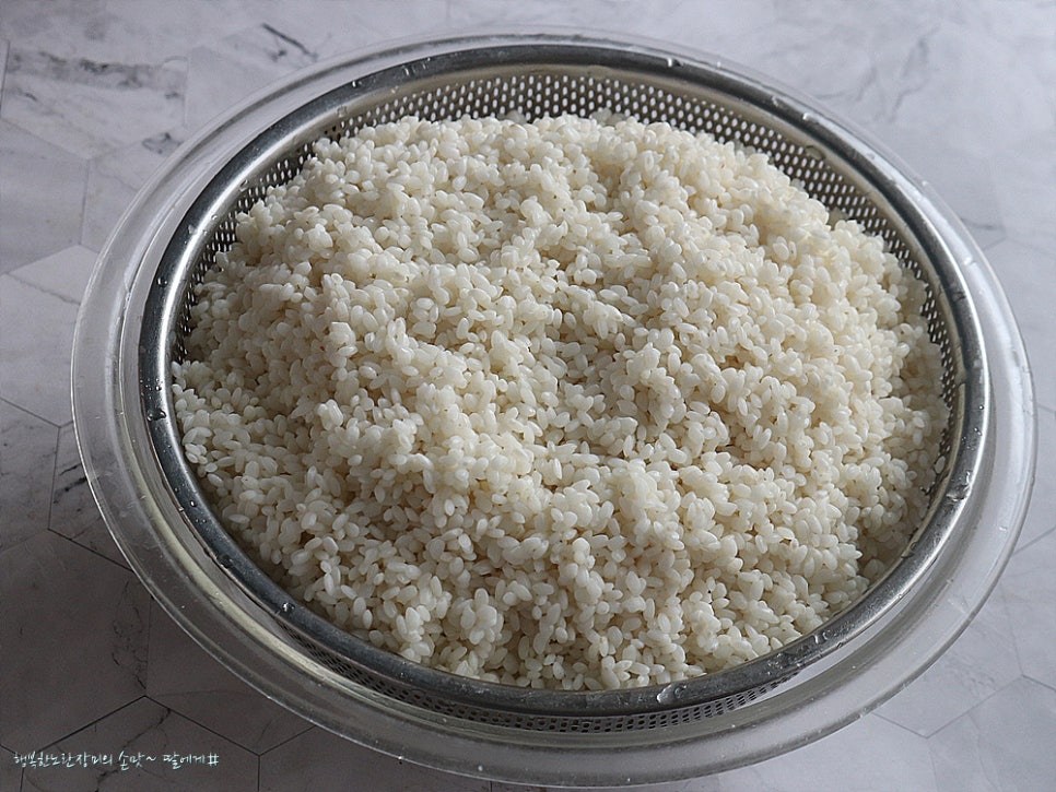 불린 찹쌀 체에 받쳐 물기를 빼주고