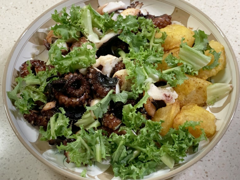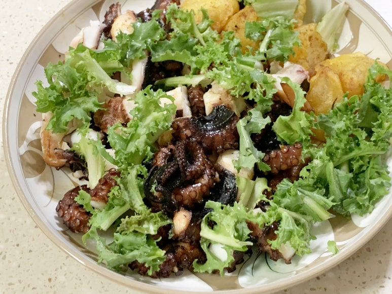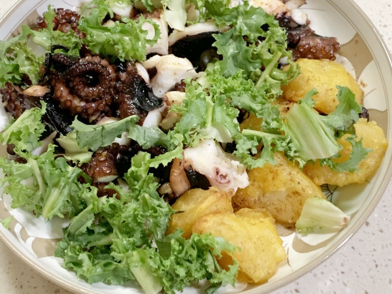 완성접시에 구워진 문어를 담아 주고 치커리와 감자튀김을 올려 줍니다.