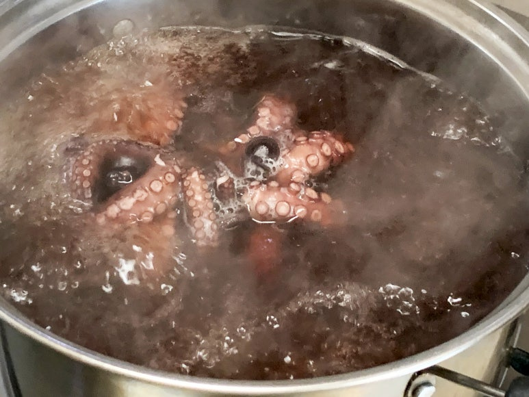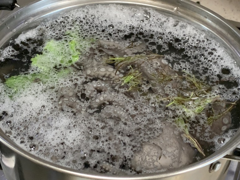 2시간 이상을 삶아 줍니다. 완전히 문어가 야들야들해질때까지.
