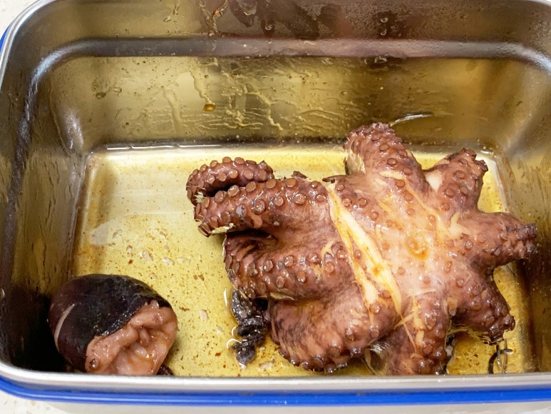 문어 몸통과 머리를 따로 담아서는 식혀 둡니다.