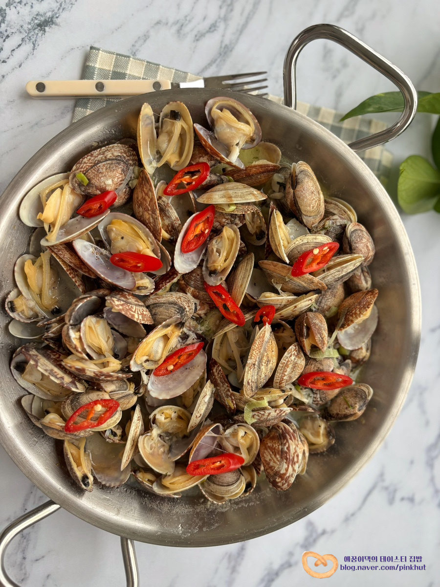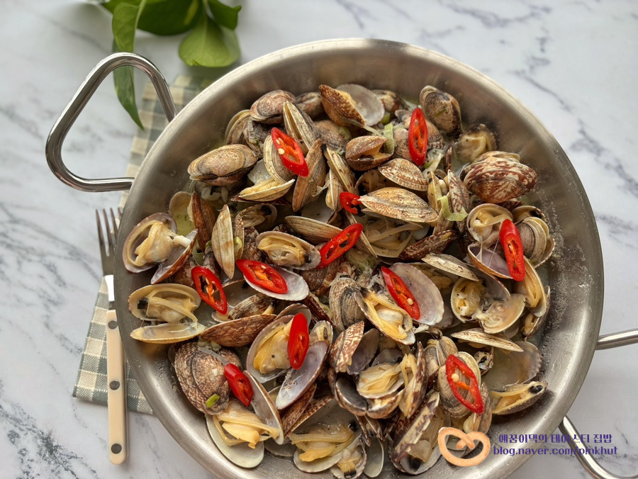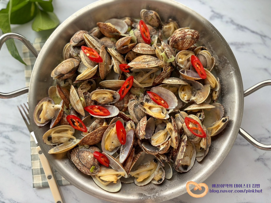 한소끔 끓여주고 후춧가루 톡톡, 홍고추 더해주면 완성이에요. 조개요리는 오래 끓이면 질겨지니 입이 다 벌어졌으면 빠르게 마무리해 주세요