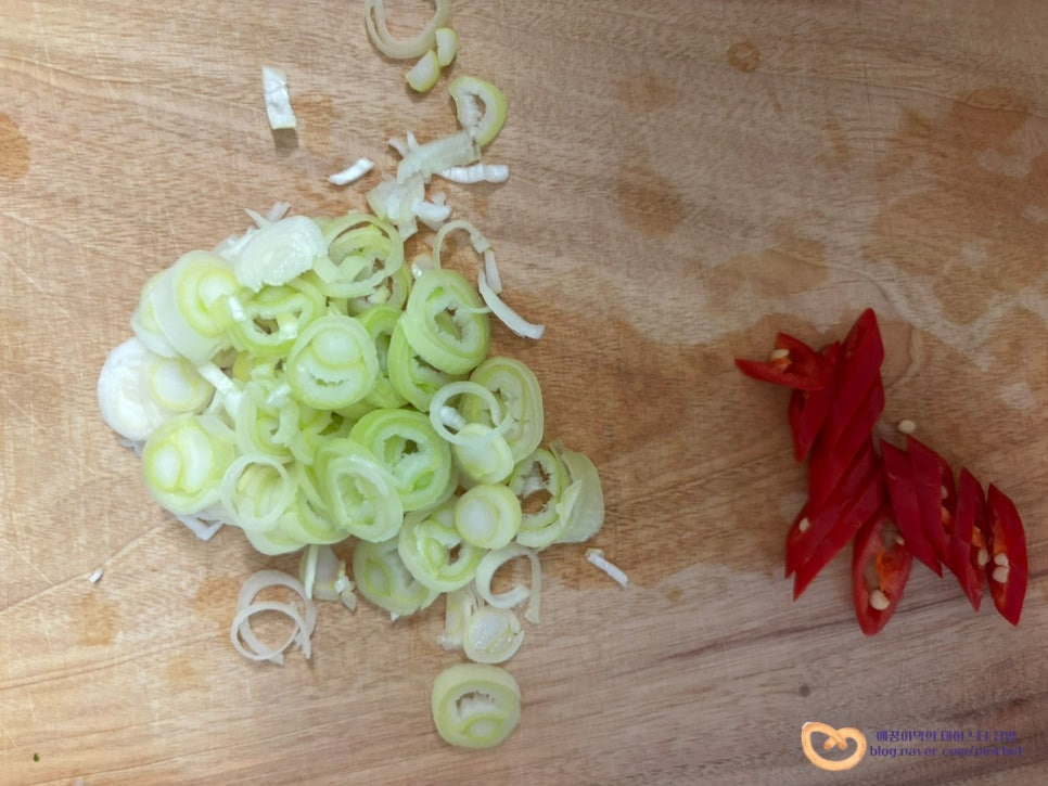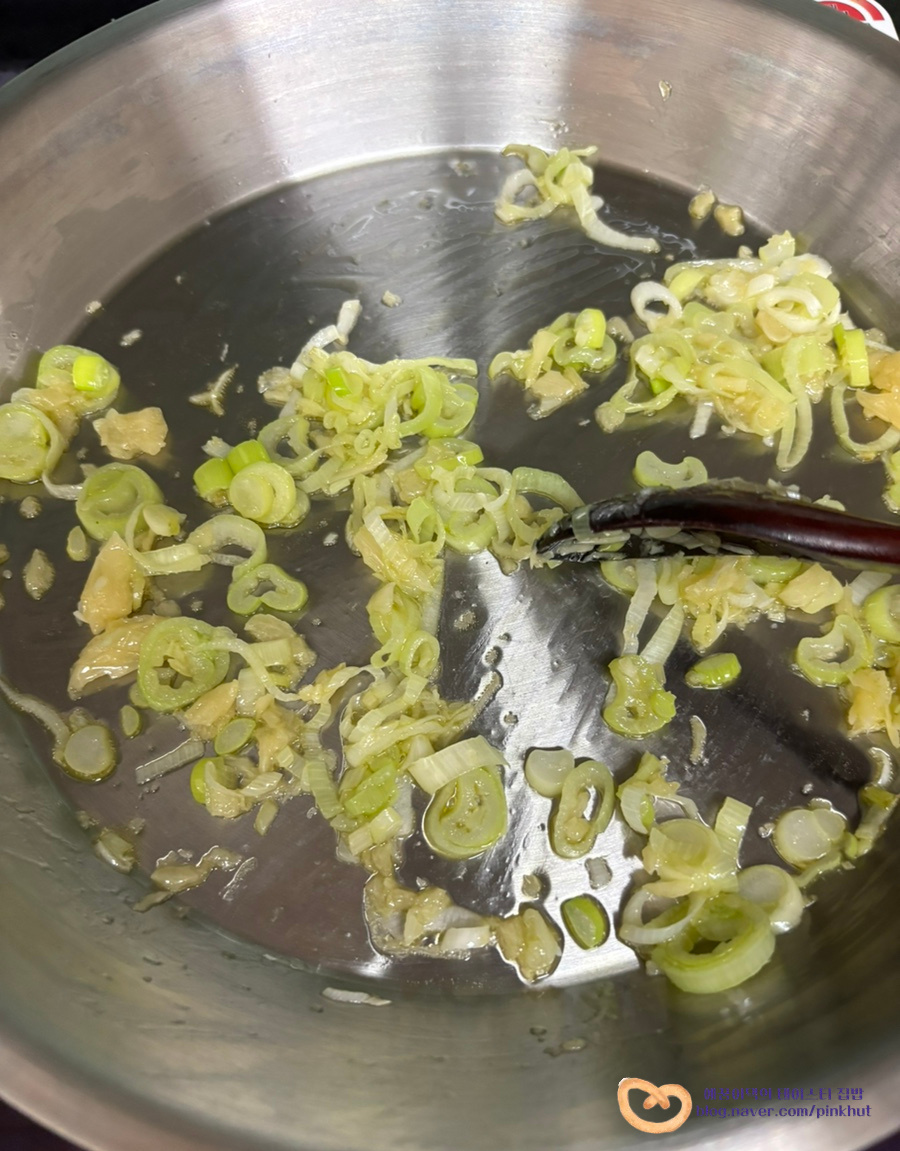프라이팬에 올리브오일 3T를 두르고 대파 다져둔 것, 다진마늘 1T를 넣어주세요