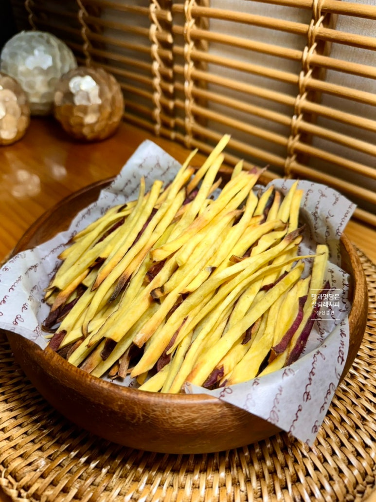 자체에서 나오는 달큼함으로 인해 설탕 등을 추가하지 않아도 구우면서 충분히 단맛이 올라오기 때문에 적당한 넓이로 길쭉하게 썰어 소량의 오일만 입혀준 뒤 시간 맞춰 에어에 구워주기만 하면 뚝딱 완성입니다. 아이들 간식으로는 물론이거니와 술안주 메뉴로도 좋아 햇고구마로 즐기는 맛있는 간식이에요.