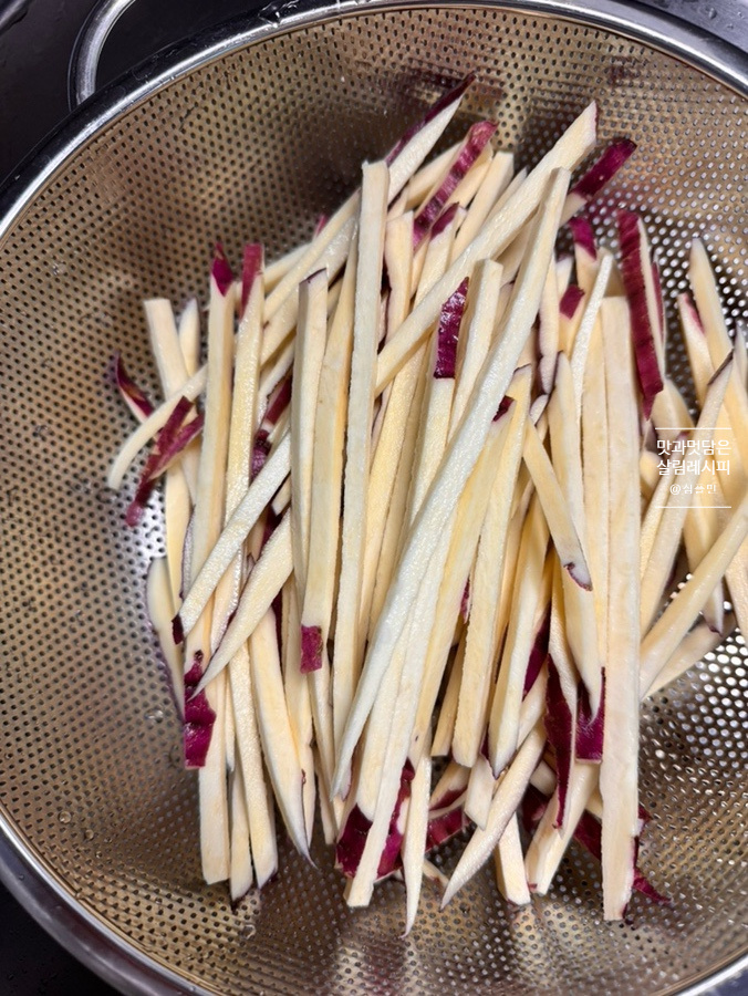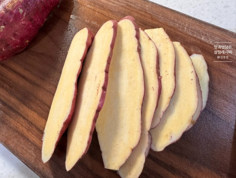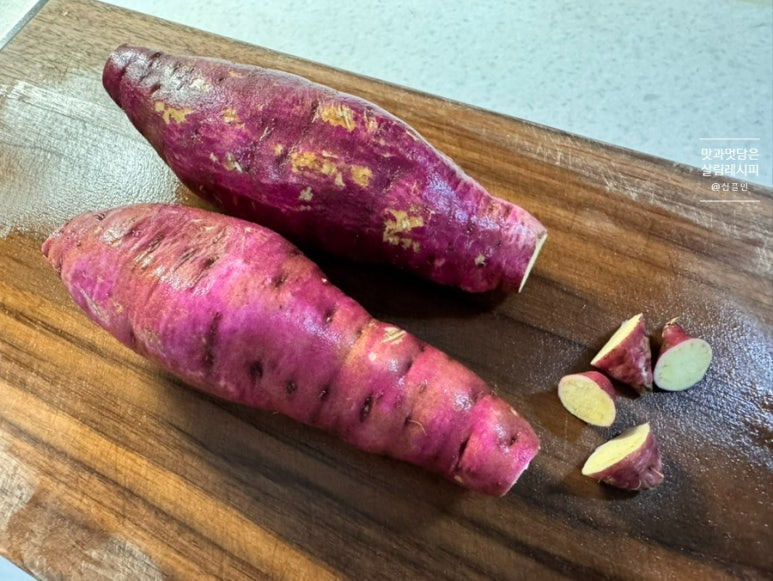 크고 길쭉한 것으로 두세 개 골라주면 썰기 더욱 좋고요. 찐고구마와는 또 다른 맛으로 식감과 맛 모두 살려 색다르게 즐길 수 있답니다.