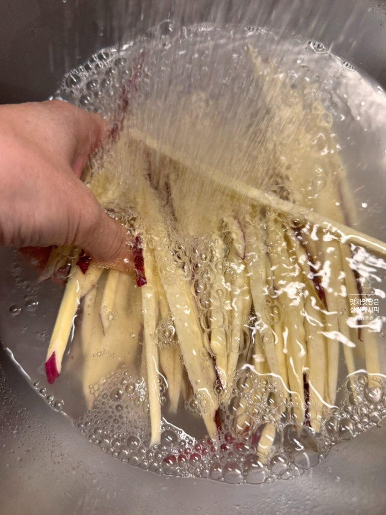 썰자마자 물에 담가주어야 갈변되는 현상도 막을 수 있고 뿌연 전분기도 제거할 수 있어요. 세네 차례 흔들어 가면서 전분기를 깔끔하게 제거해 주어야 서로 달라붙지 않으면서 바삭하고 단단하게 구워낼 수 있어요. 채반에 놓고 1차적으로 물기를 제거하고요.