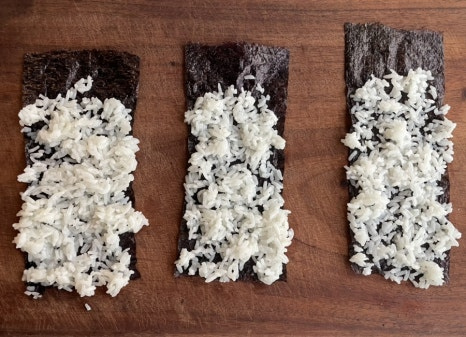 김을 3등분해서 작게 말아 주니까 말기도 편하고 먹기도 편한 게 꼬마 김밥의 장점이더라구요.