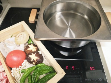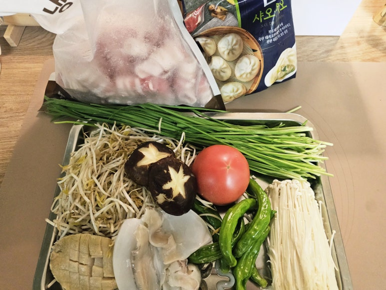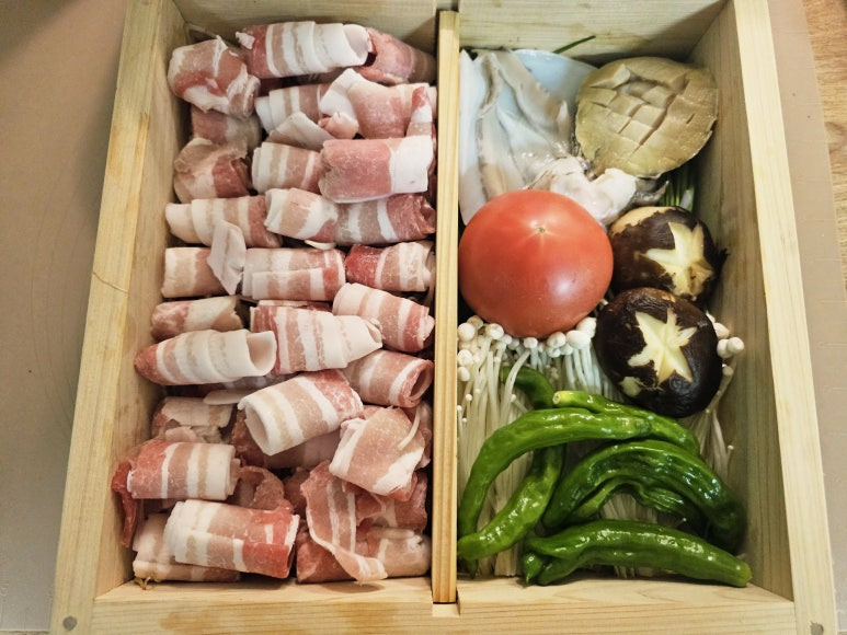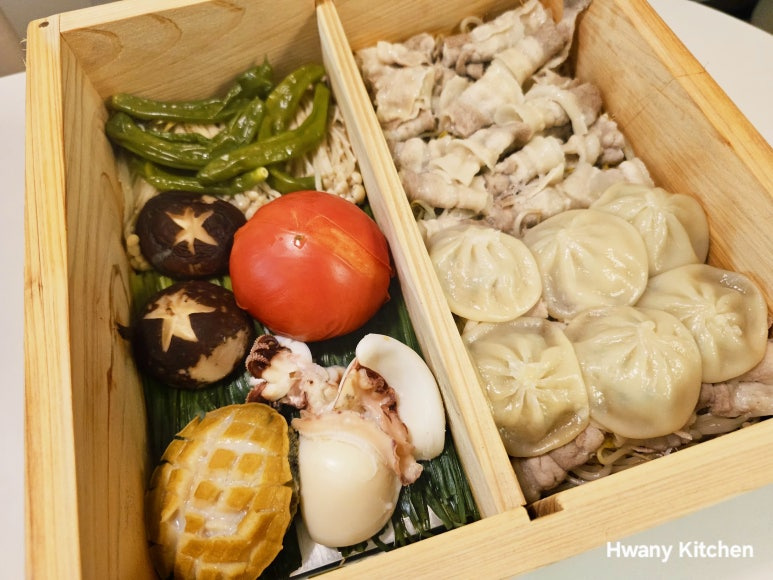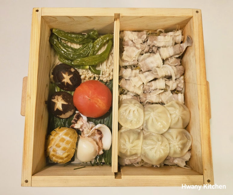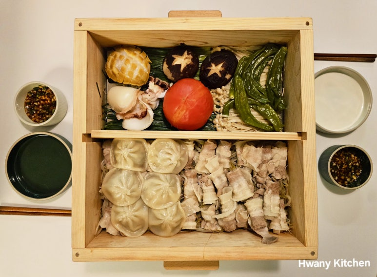 숙주나물위에 대패삼겹살을 하나하나 이쁘게 쌓아주고 옆칸에는 준비해놓은 갑오징어, 전복, 꽈리고추, 토마토(방울토마토도 아주 좋음, 편백향이 스며든 토마토 대박 맛남) 그리고 배를 든든히 채우기위해 냉동만두도 넣어서 세팅해주고 뜨거운 스팀으로 찜해주러 GO GO~