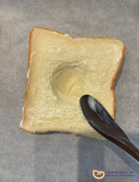 가운데 부분을 숟가락으로 눌러서 계란 들어갈 자리를 만들어 주세요 바닥면이 찢어지지 않게 해 주시고요 계란 들어갈 공간은 넉넉히 잡아주시면 좋아요.