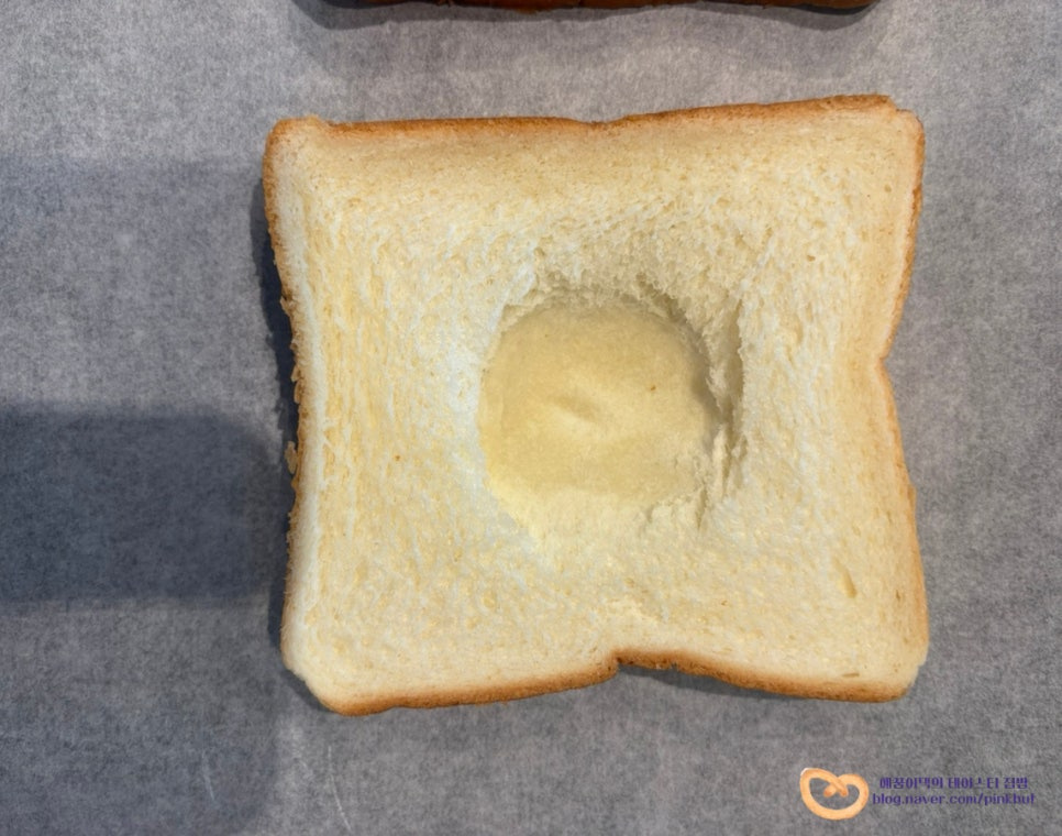 식빵은 2장을 준비했어요. 집에 있는 식빵을 활용하시면 되는데 저는 살짝 도톰한 두께를 사용했더니 계란 들어갈 자리 잡기가 더 편했어요 :)
