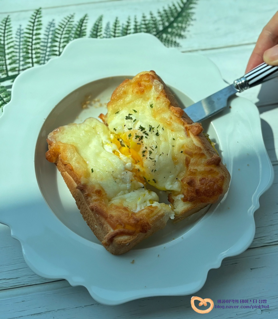이럴 때는 오븐에 더 굽기보다는 전자레인지에 살짝 돌려서 계란 노른자를 조금 더 익혀주면 좋아요. 오늘의 팁! 치즈가 딱딱해지지 않으면서 달걀의 익힘 상태를 조절하실 수 있어요